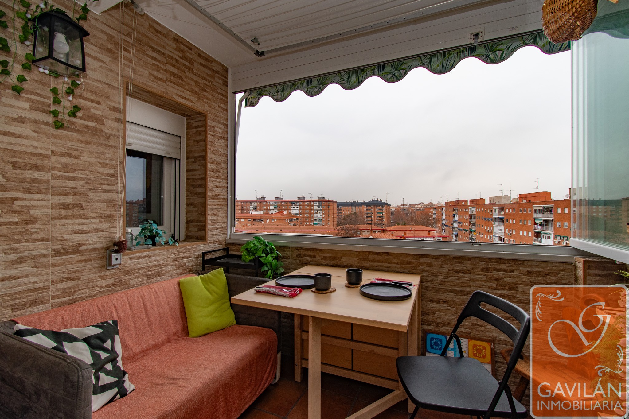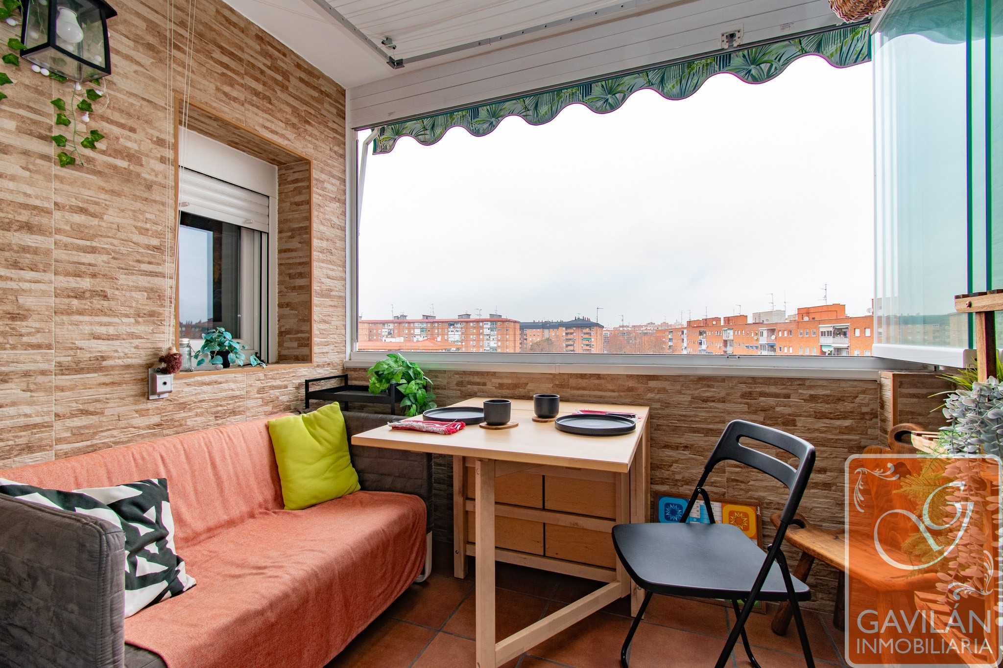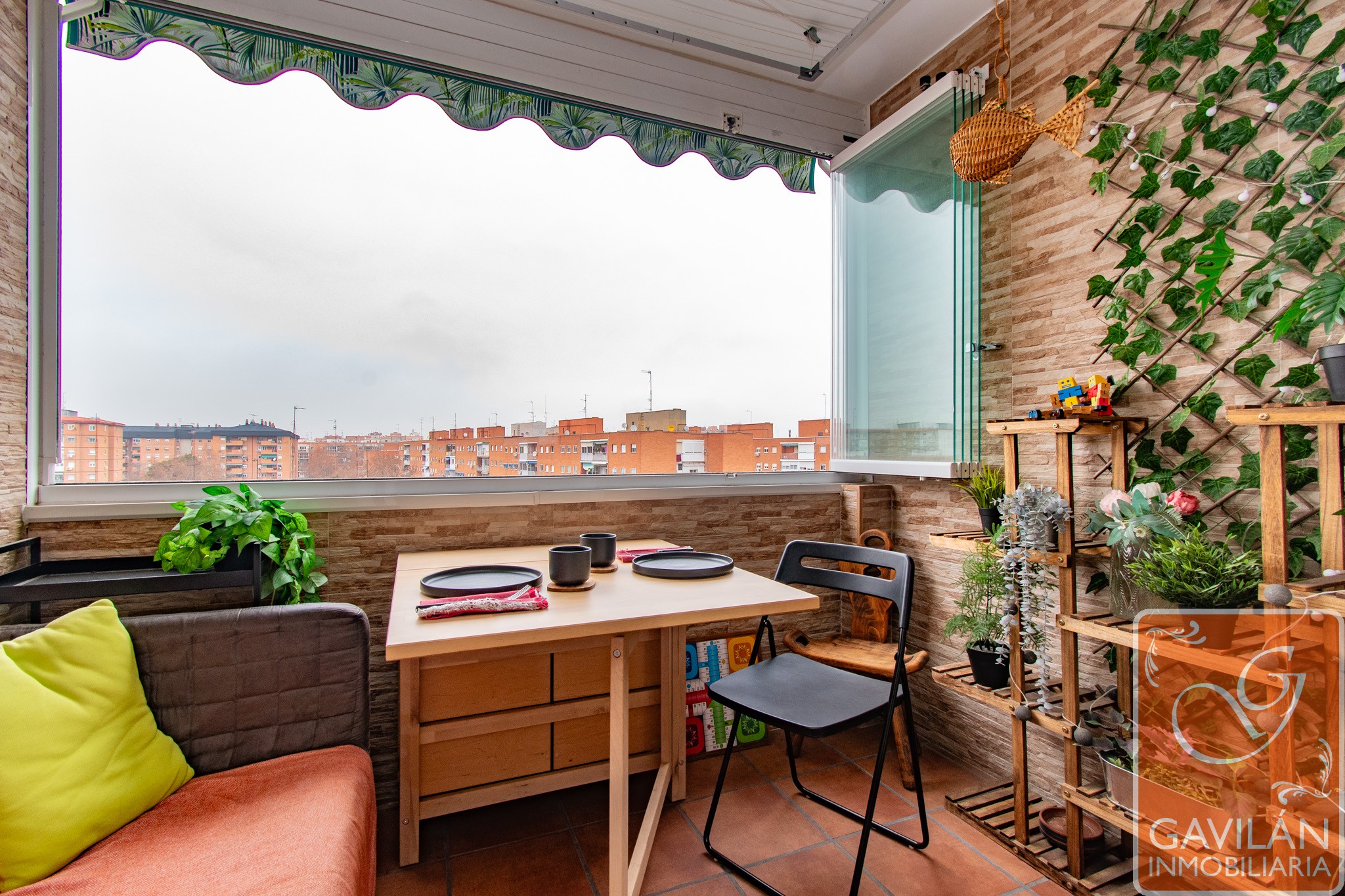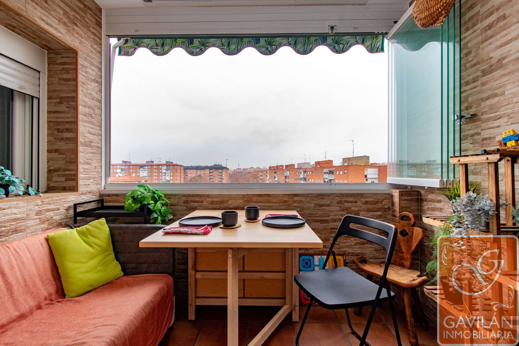 Desde el salón salimos a una terraza acristalada, ampliada y perfectamente aprovechable en cualquier estación. Sus cortinas de vidrio plegables permiten abrirla por completo o cerrarla para disfrutarla como un espacio interior más. Dispone de toldo y tendero de techo, convirtiéndola en un rincón práctico y agradable.