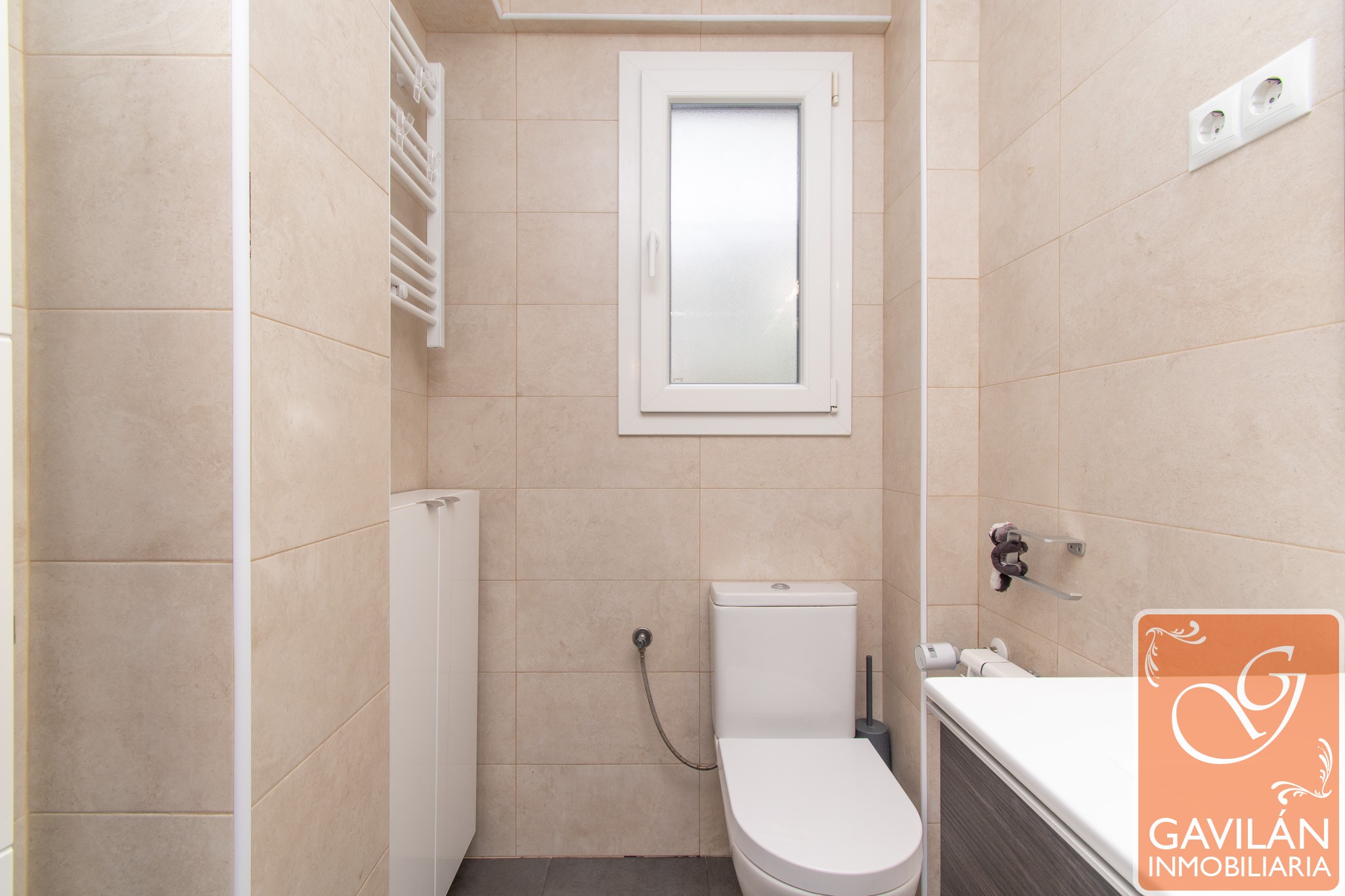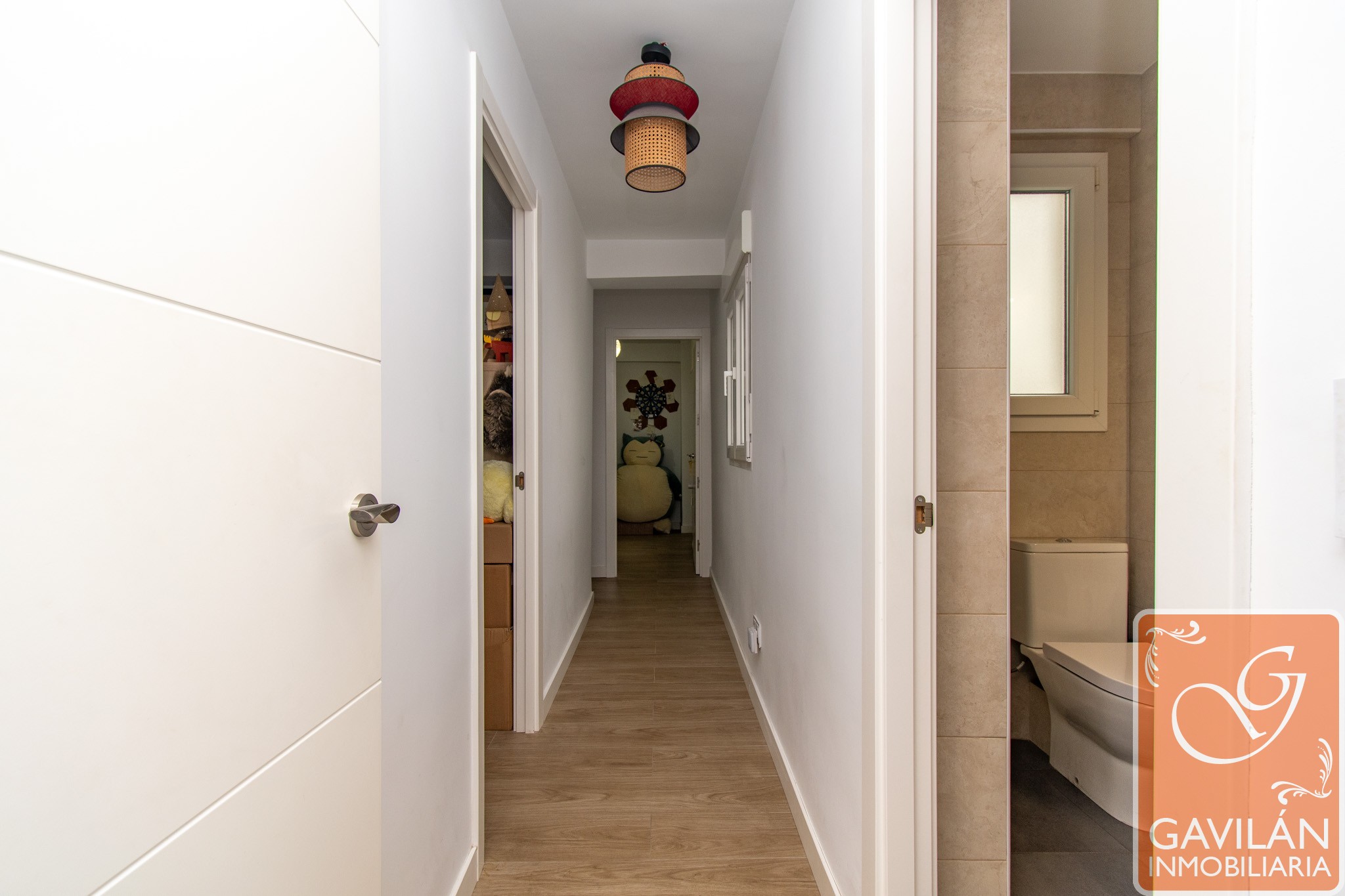 El recorrido continúa por un pasillo con ventana a un patio interior, que aporta luz natural y ventilación. Desde aquí accedemos al baño, también reformado, cuidando cada detalle para el confort diario.