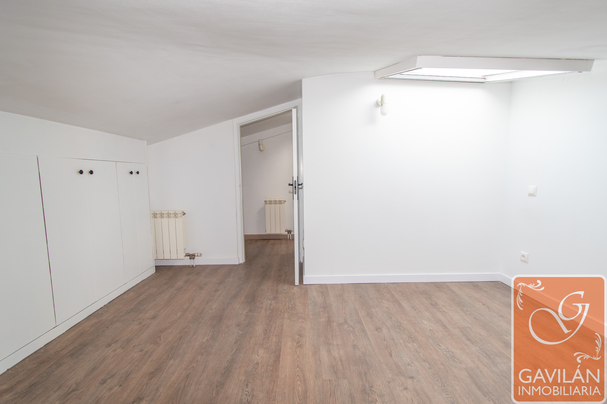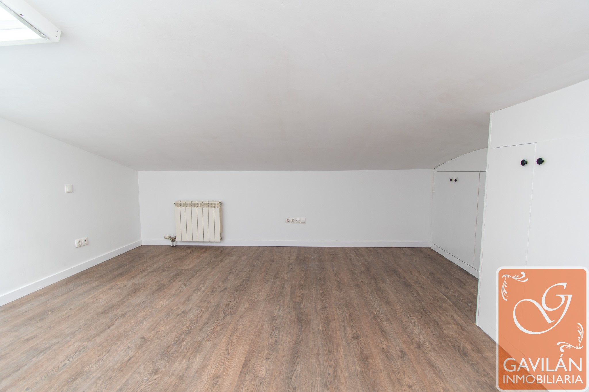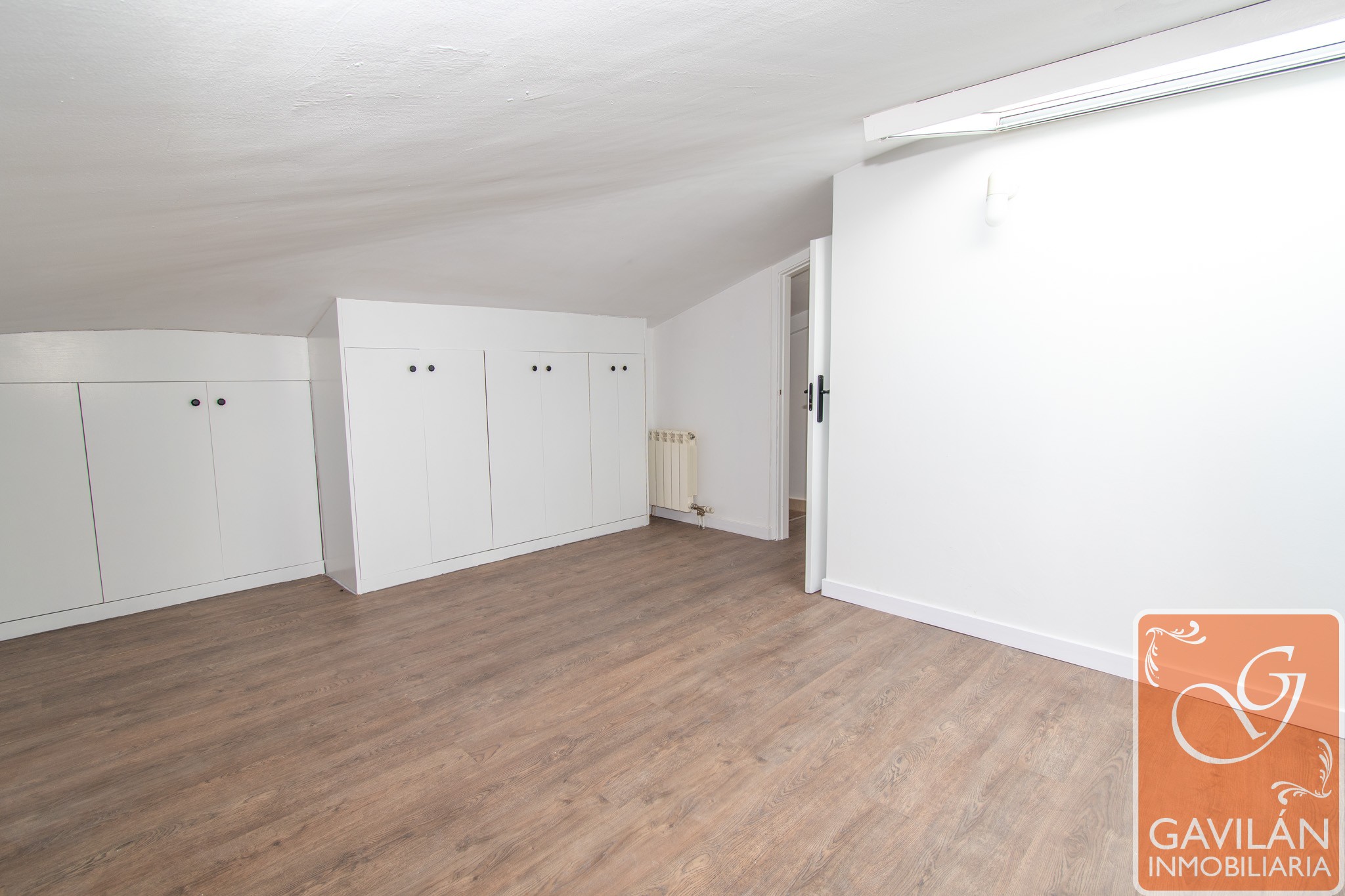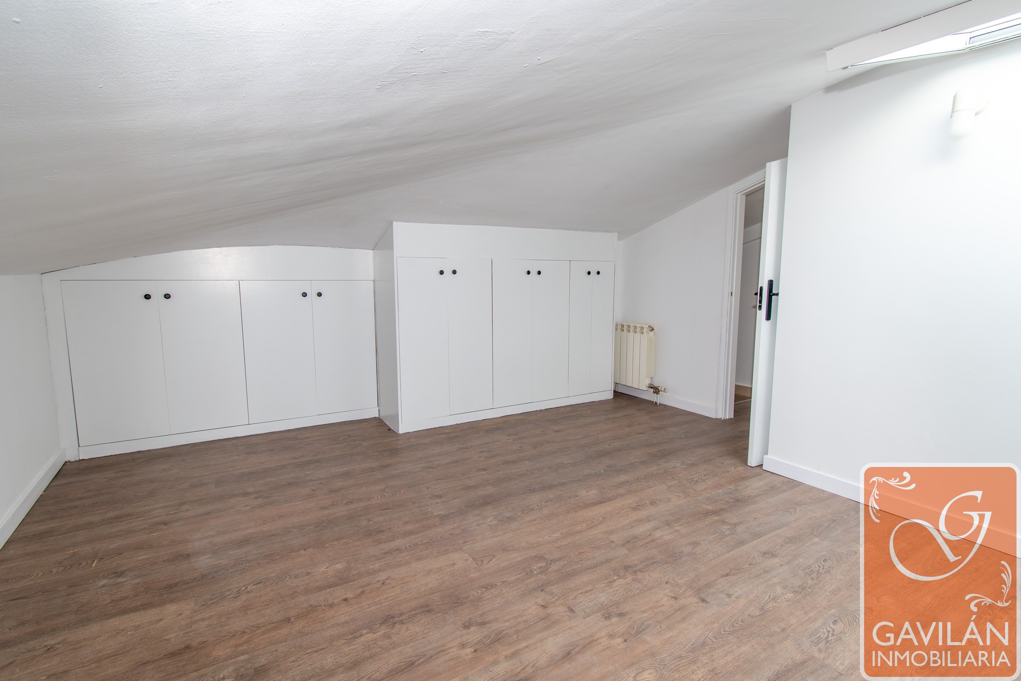 La planta superior alberga la zona de descanso, con un amplio dormitorio que destaca por su luz natural gracias a sus ventanas tipo Velux y por su gran capacidad de almacenaje con armarios empotrados. Completa esta planta un baño moderno con plato de ducha, mampara y acabados actuales.