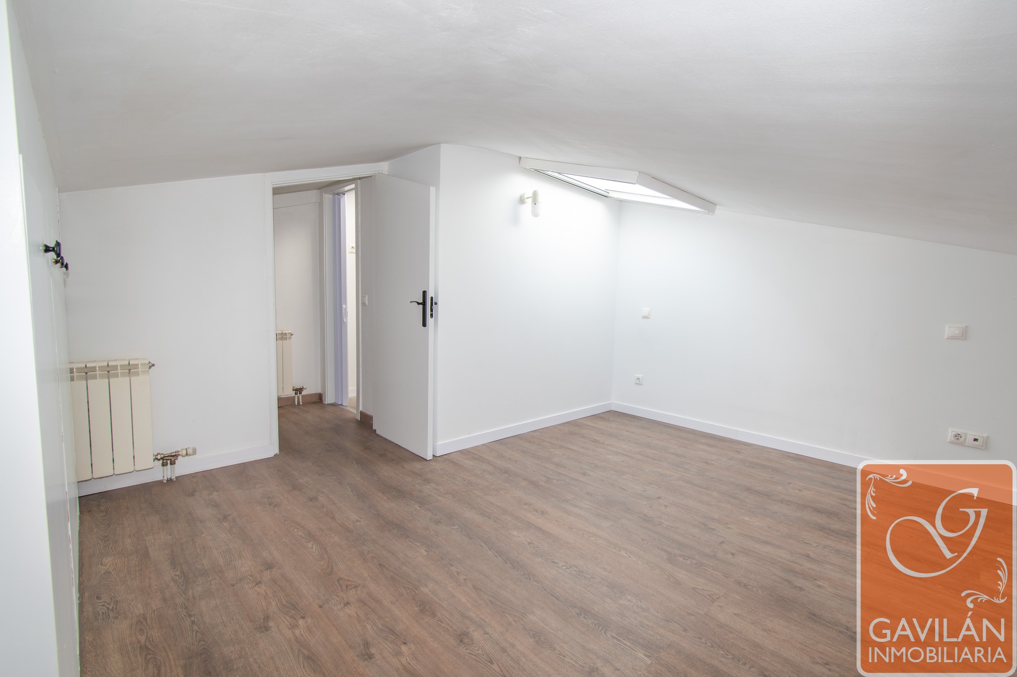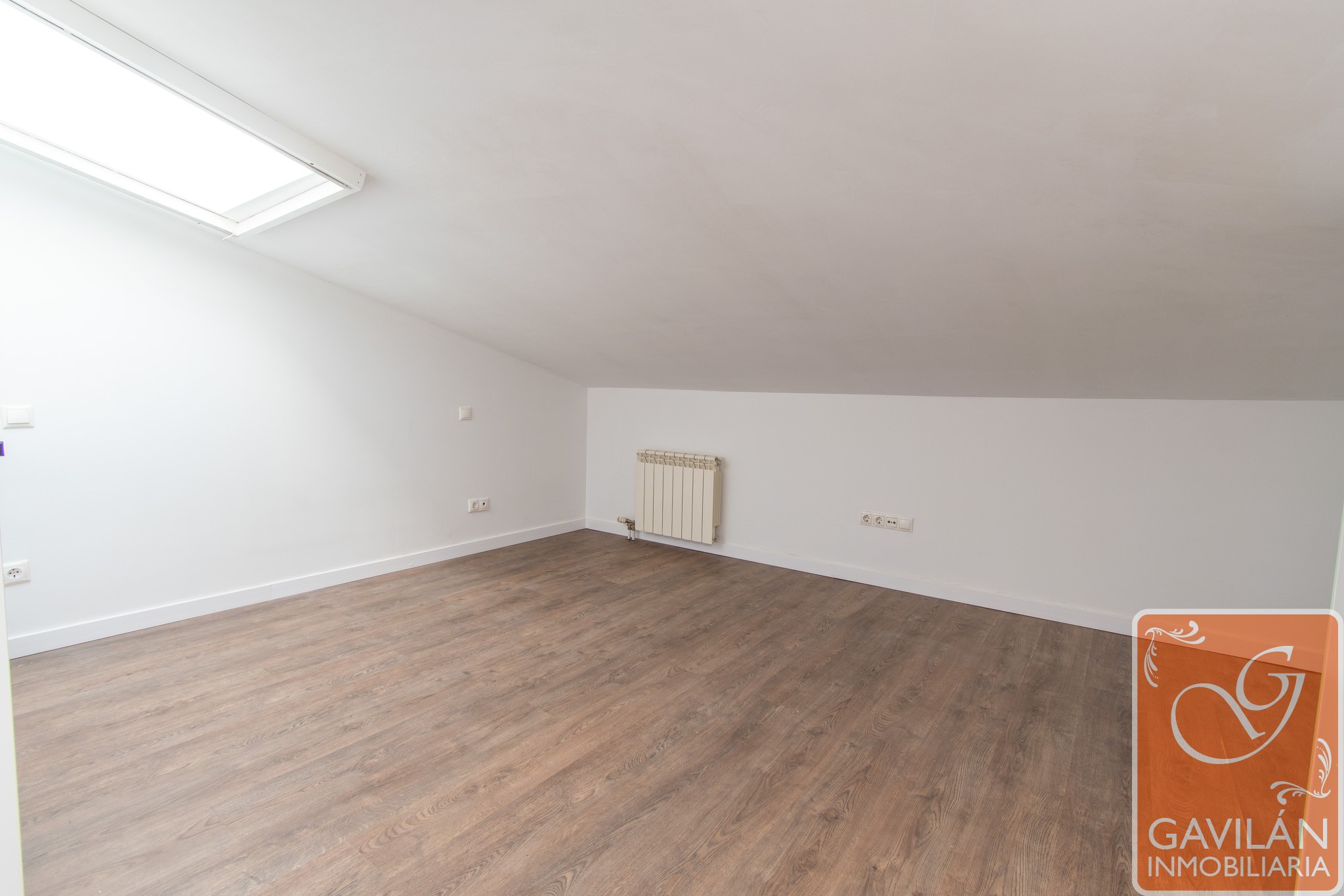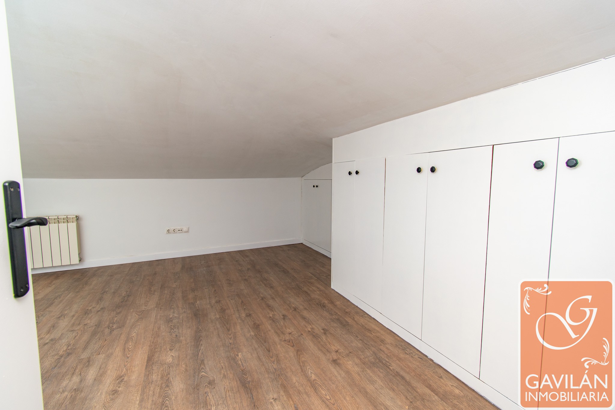 La planta superior alberga la zona de descanso, con un amplio dormitorio que destaca por su luz natural gracias a sus ventanas tipo Velux y por su gran capacidad de almacenaje con armarios empotrados. Completa esta planta un baño moderno con plato de ducha, mampara y acabados actuales.