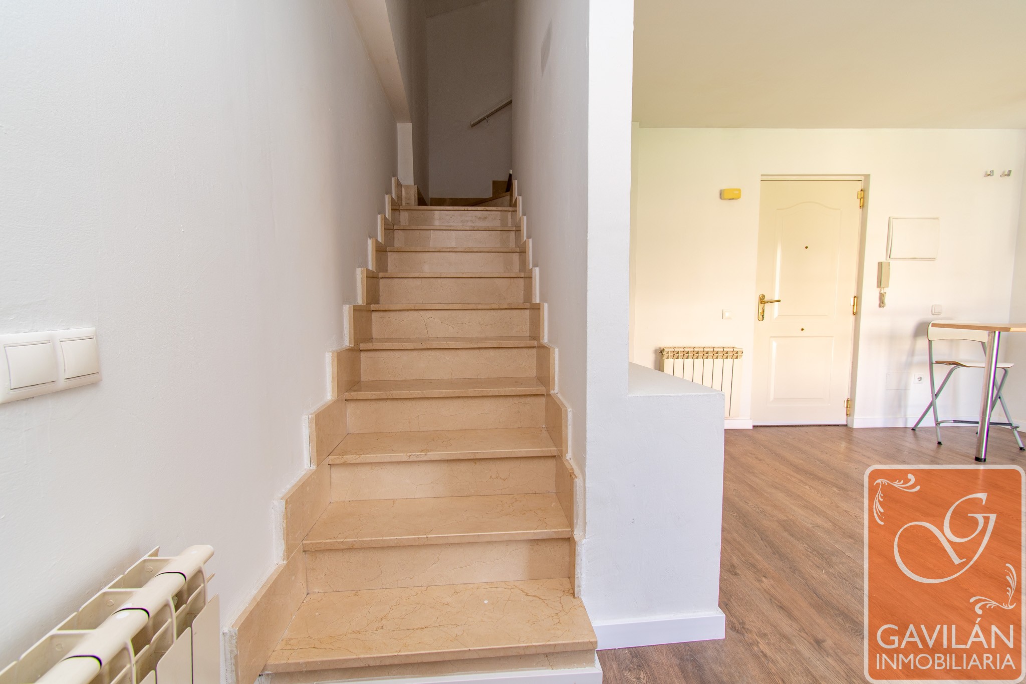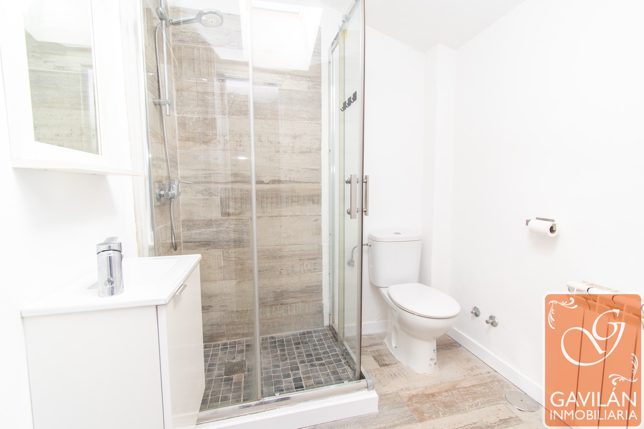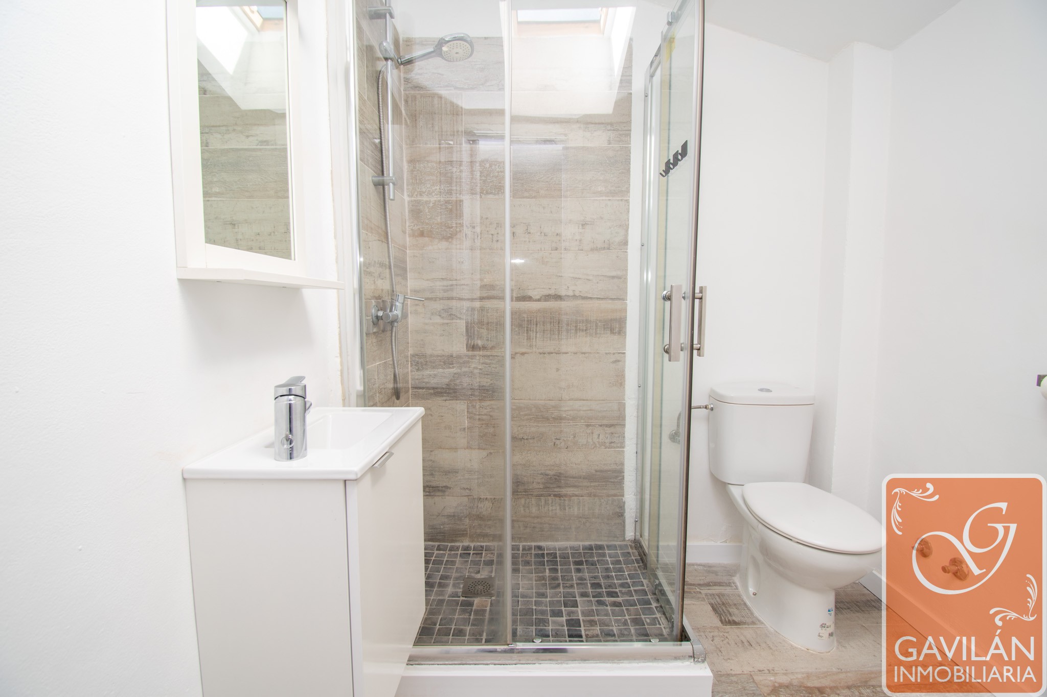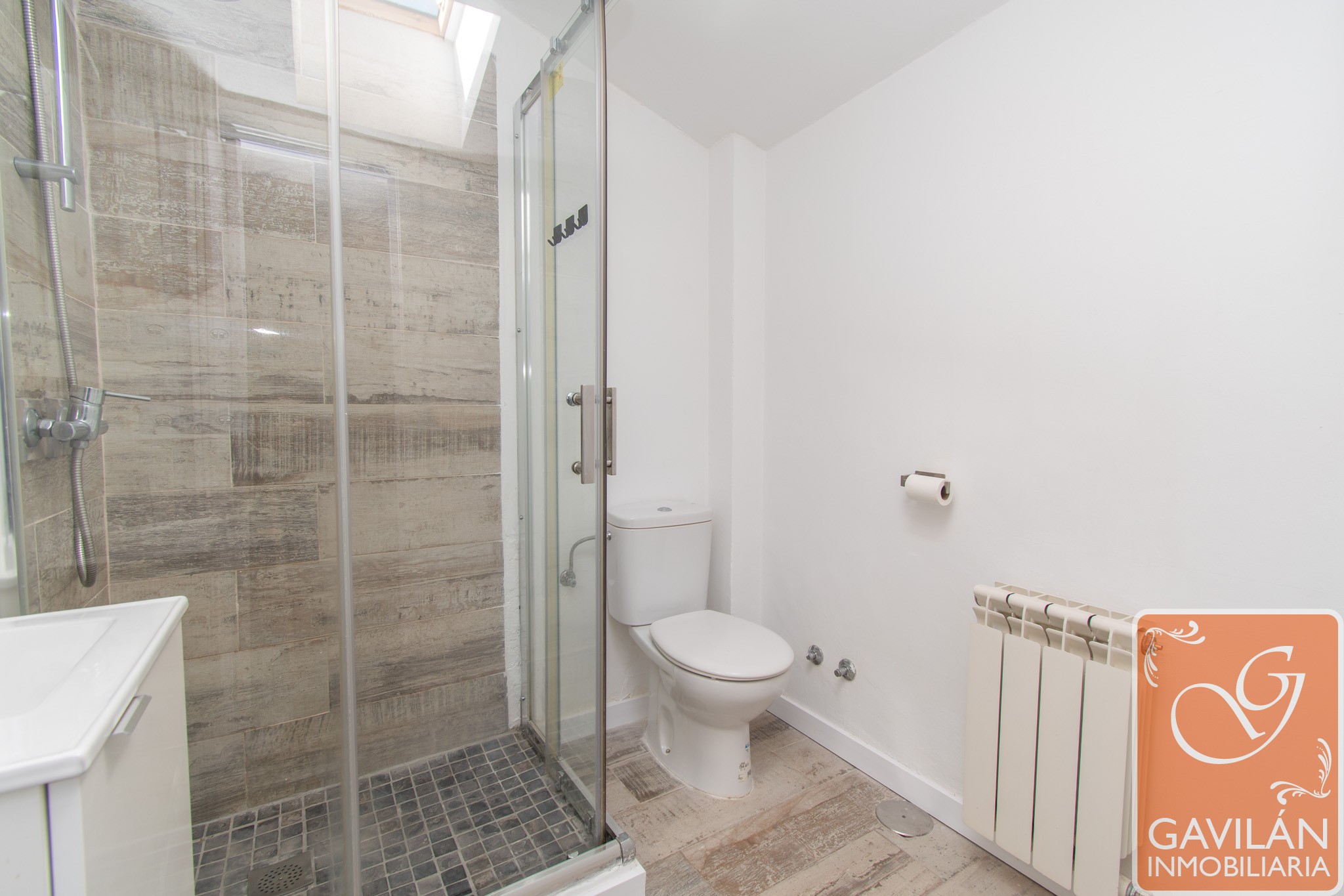La planta superior alberga la zona de descanso, con un amplio dormitorio que destaca por su luz natural gracias a sus ventanas tipo Velux y por su gran capacidad de almacenaje con armarios empotrados. Completa esta planta un baño moderno con plato de ducha, mampara y acabados actuales.