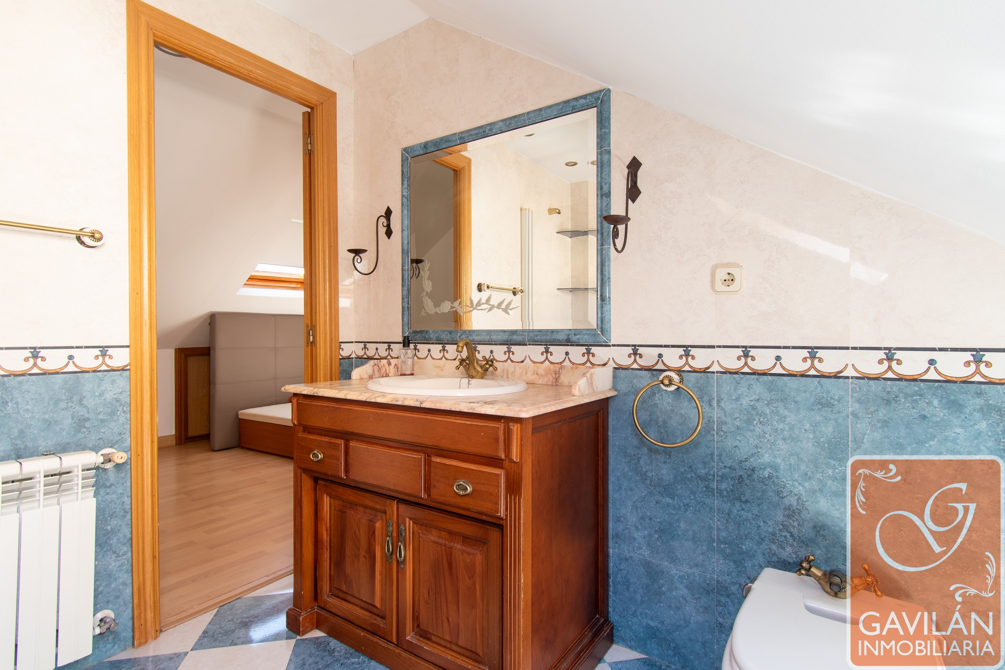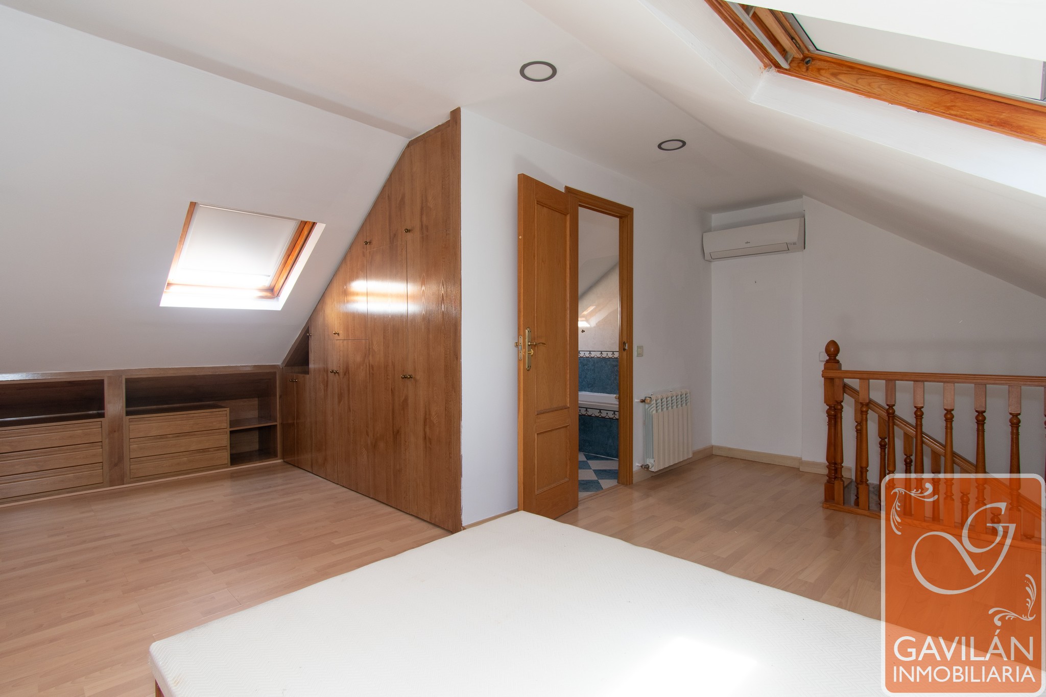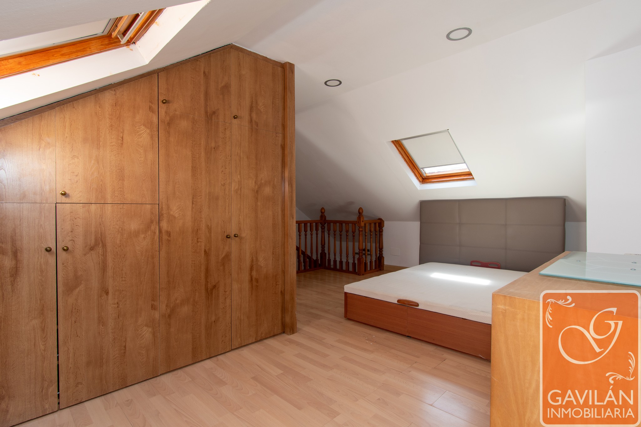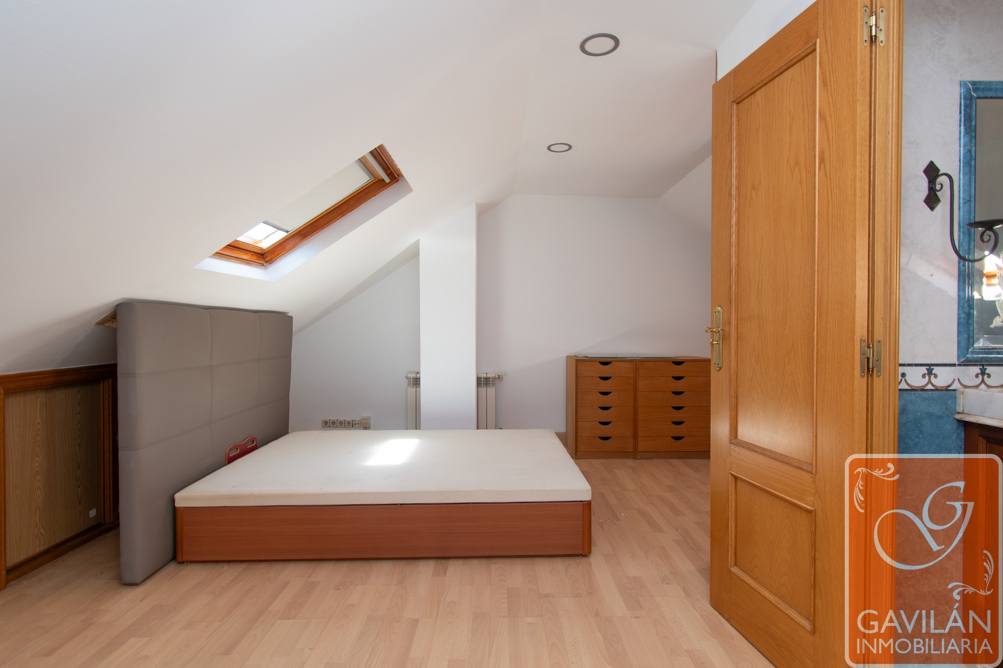 En la luminosa buhardilla gracias a los Velux que dejan pasar la luz natural se encuentra el dormitorio principal, armarios bajo cubierta y vestidor. También dispone de un bonito baño completo con bañera hidromasaje, halógenos y Velux.