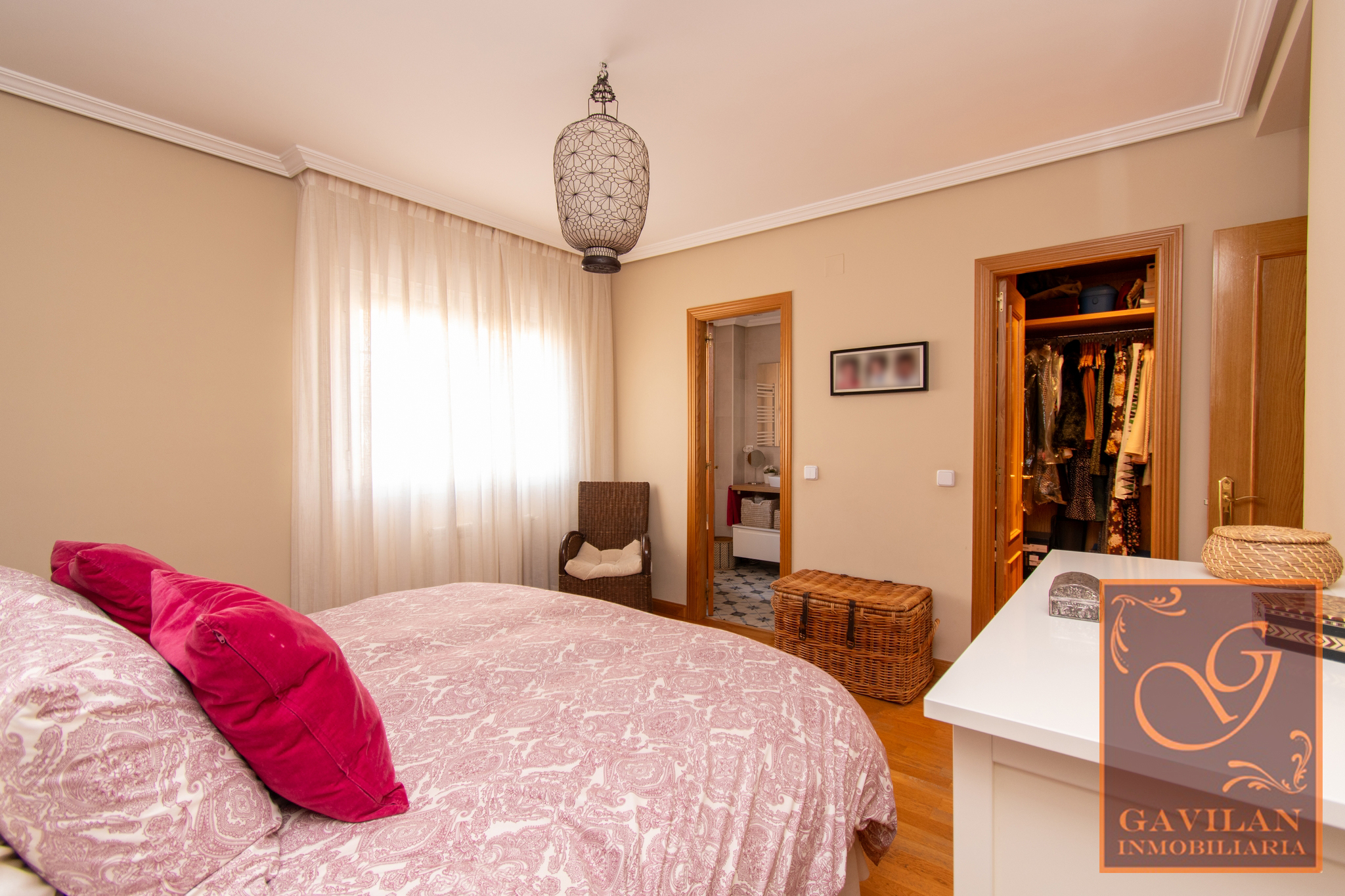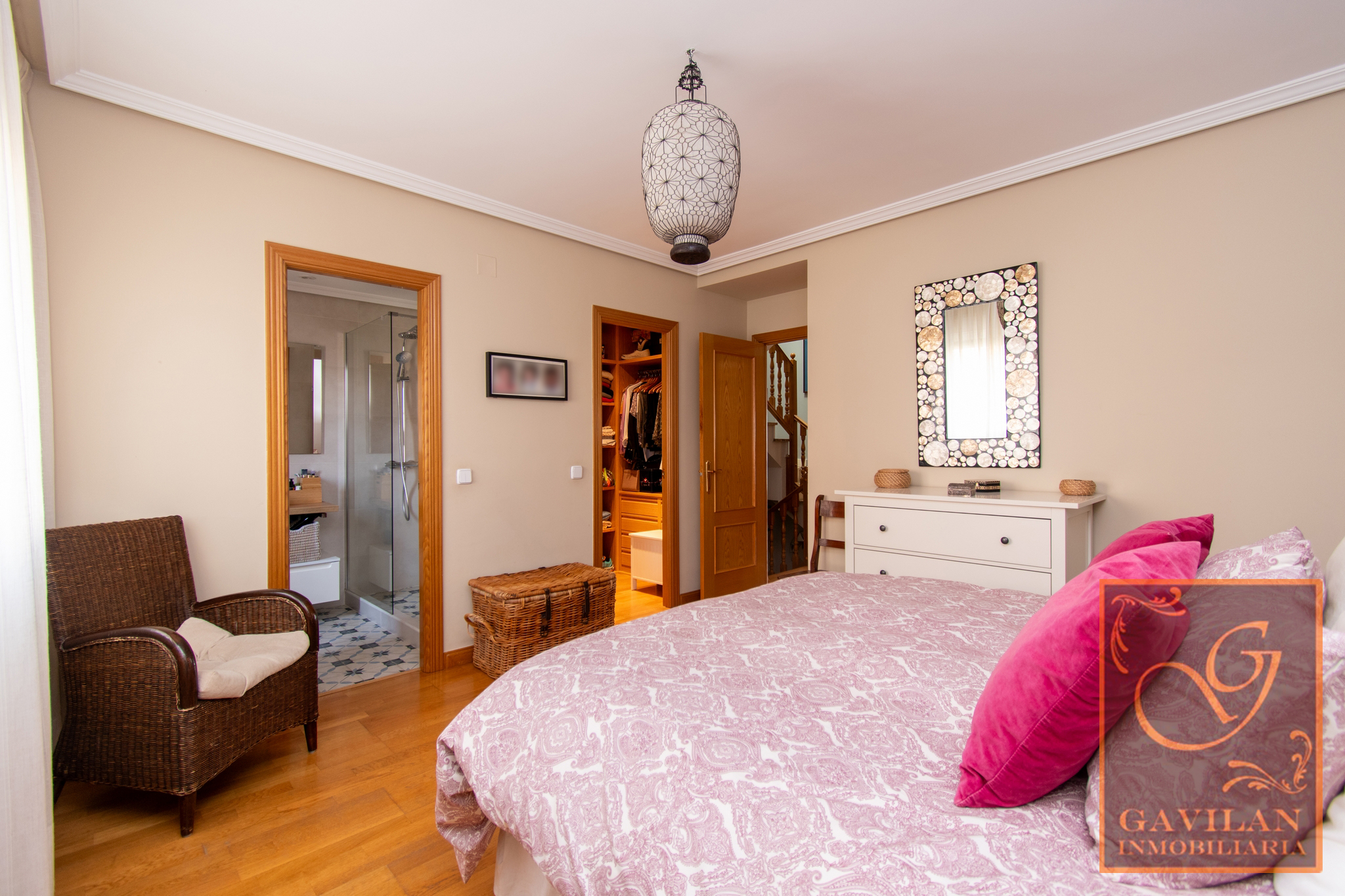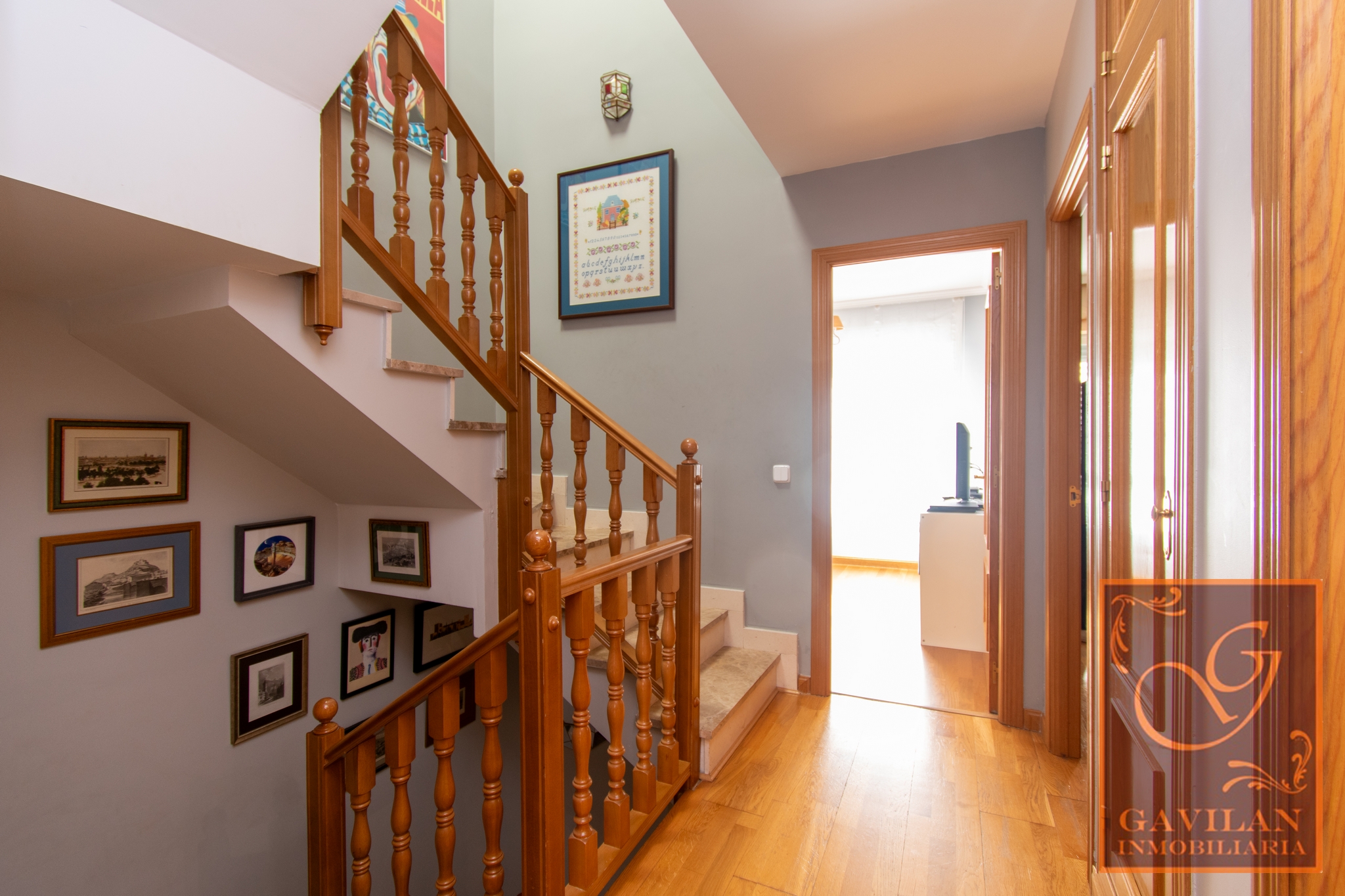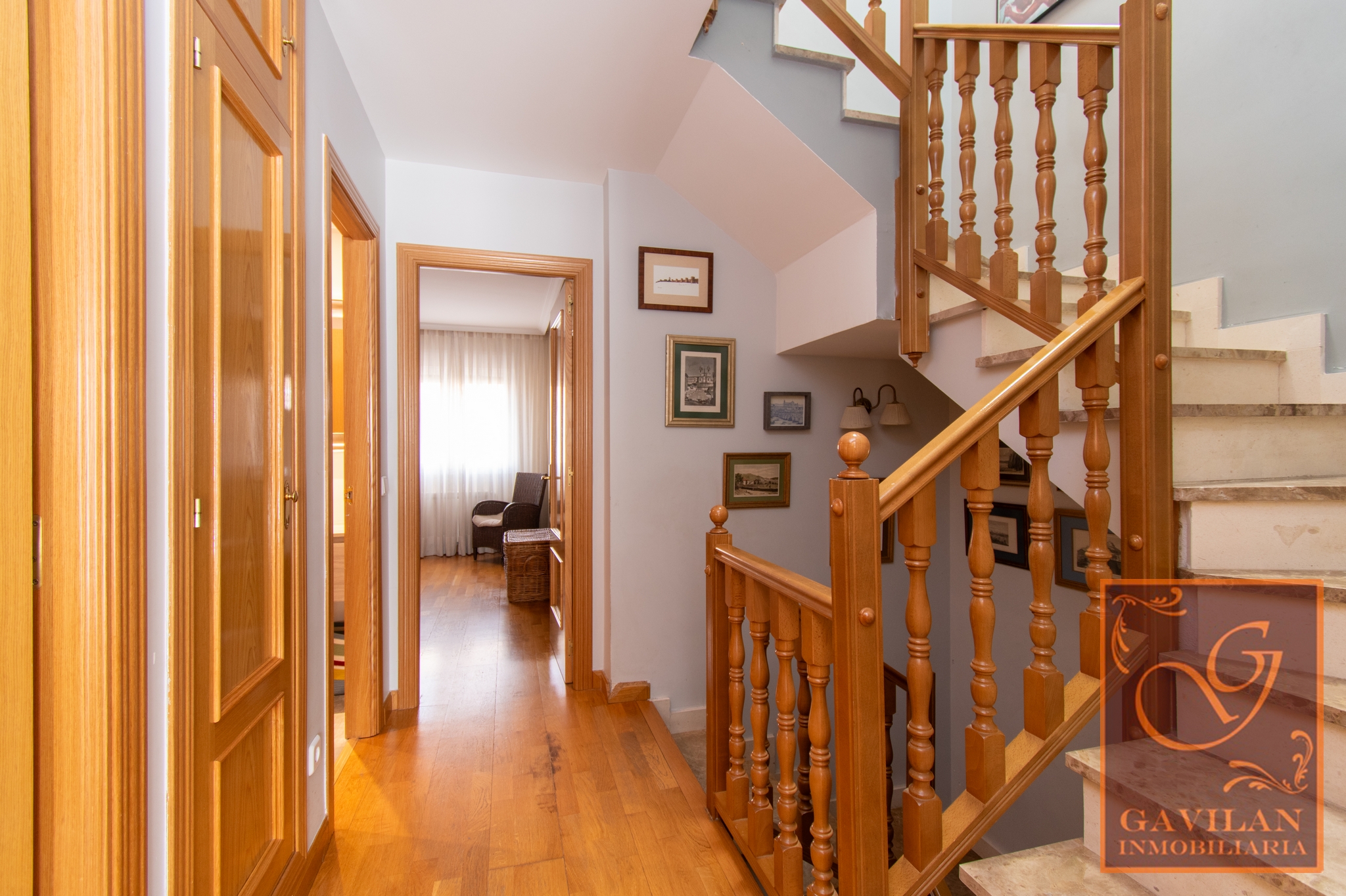 En la primera planta encontramos distribuidor con armario empotrado y 3 dormitorios dobles. El principal es tipo suite, dotado de vestidor y baño privado dentro del dormitorio. Disponemos de otro amplio baño completo equipado con plato de ducha con mampara.