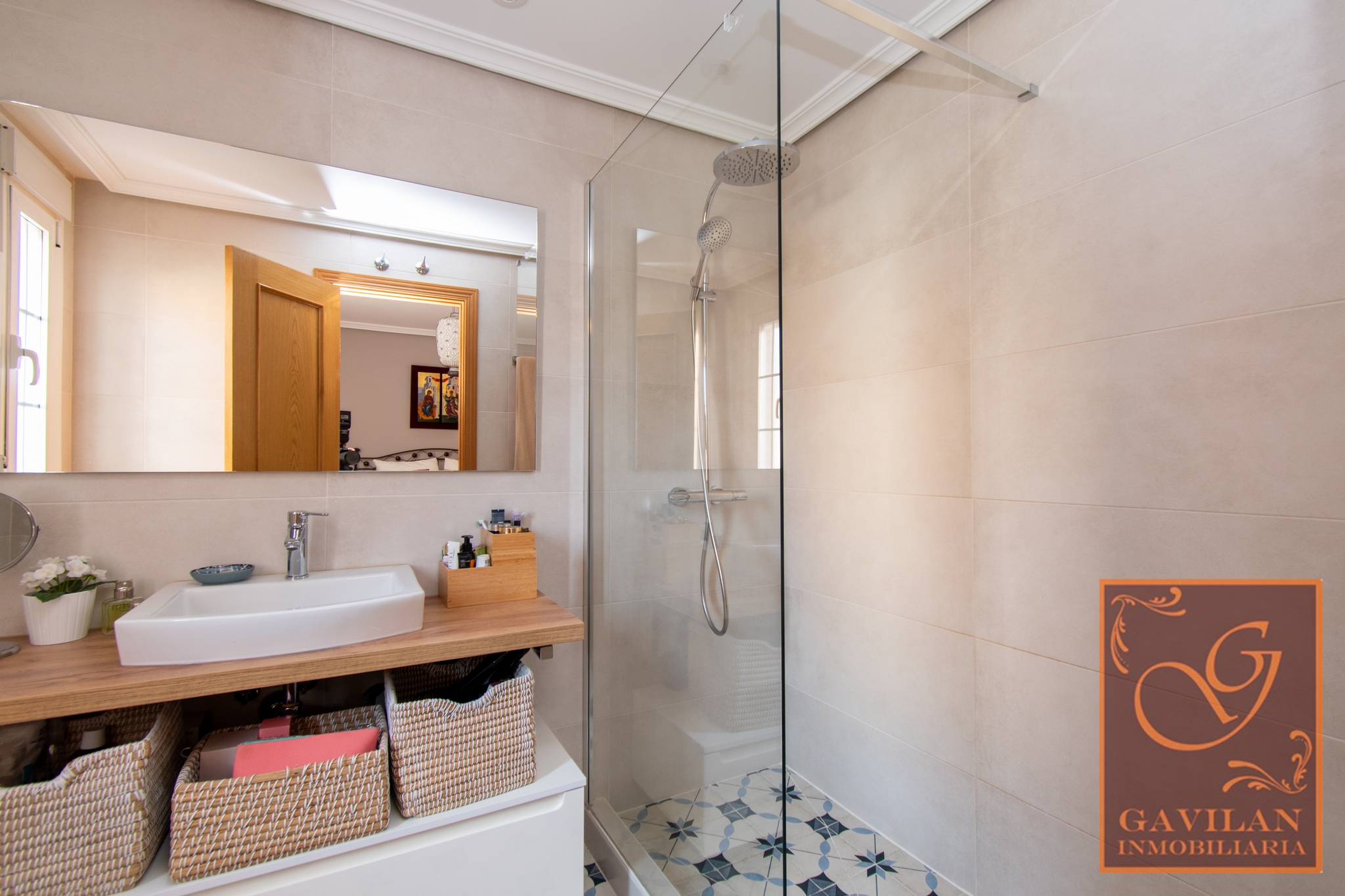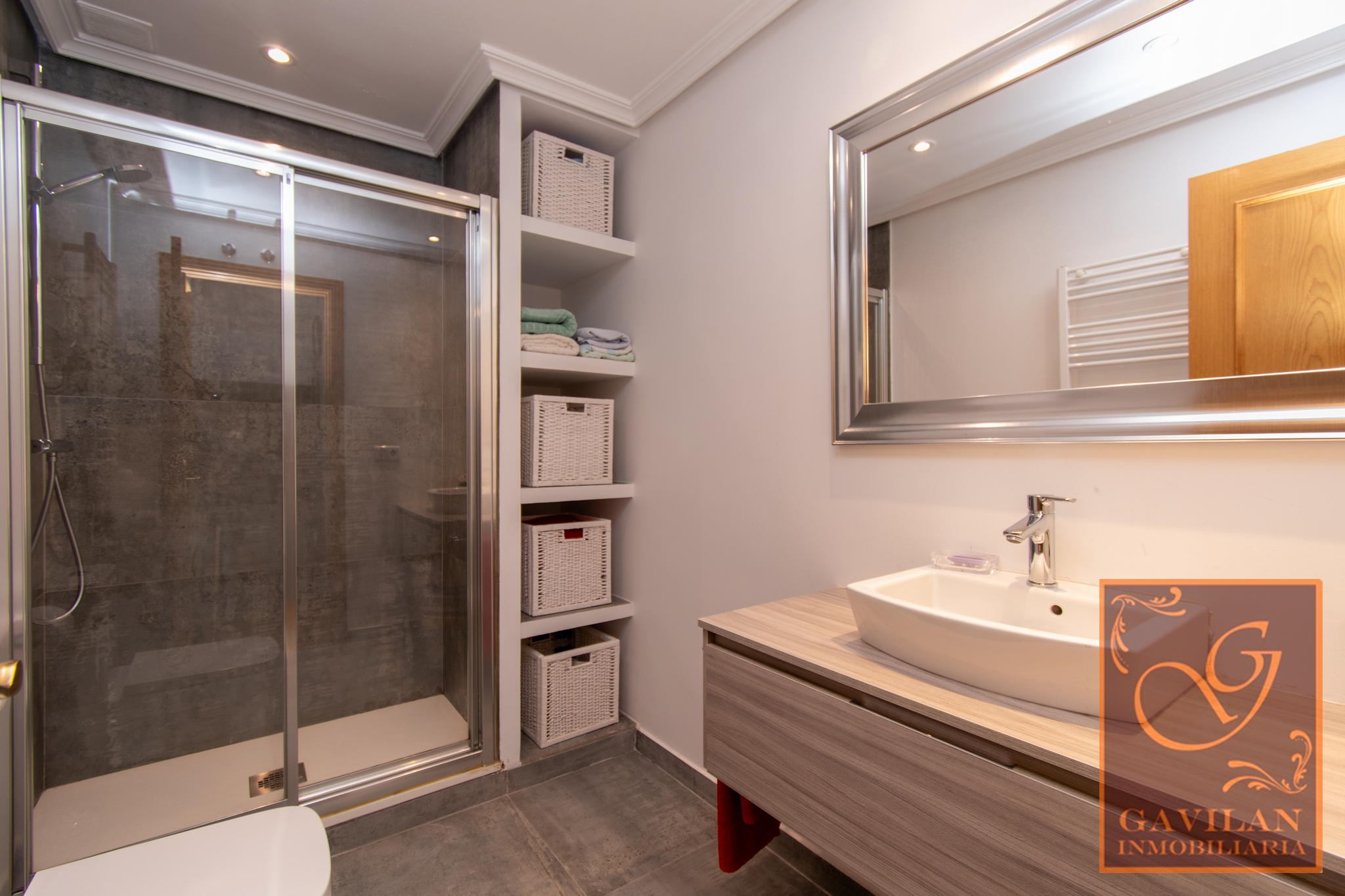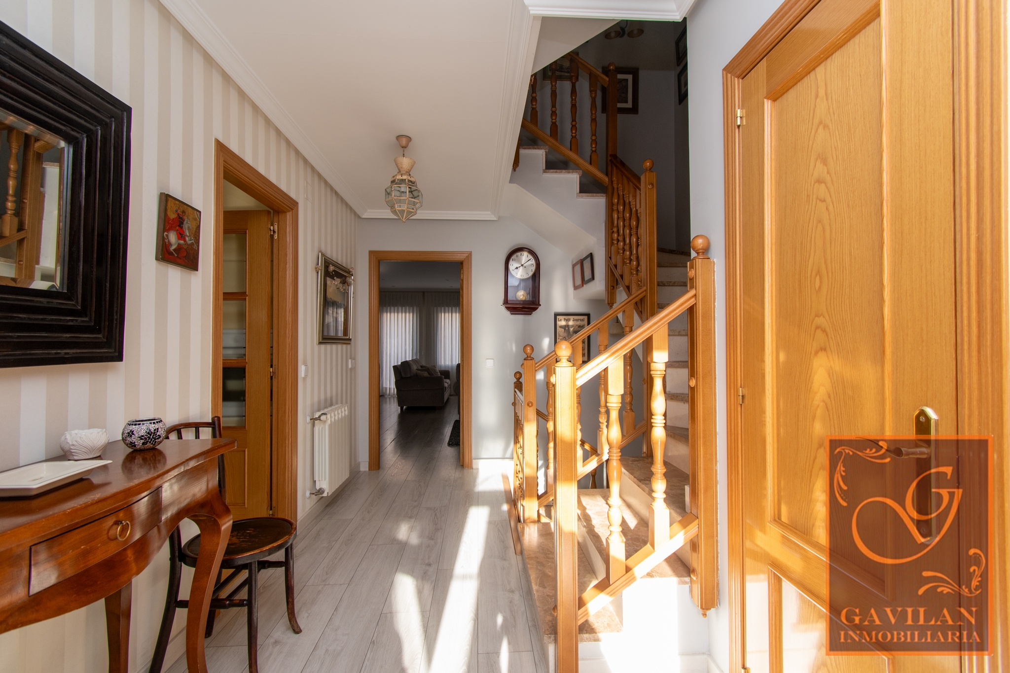 En la primera planta encontramos distribuidor con armario empotrado y 3 dormitorios dobles. El principal es tipo suite, dotado de vestidor y baño privado dentro del dormitorio. Disponemos de otro amplio baño completo equipado con plato de ducha con mampara.