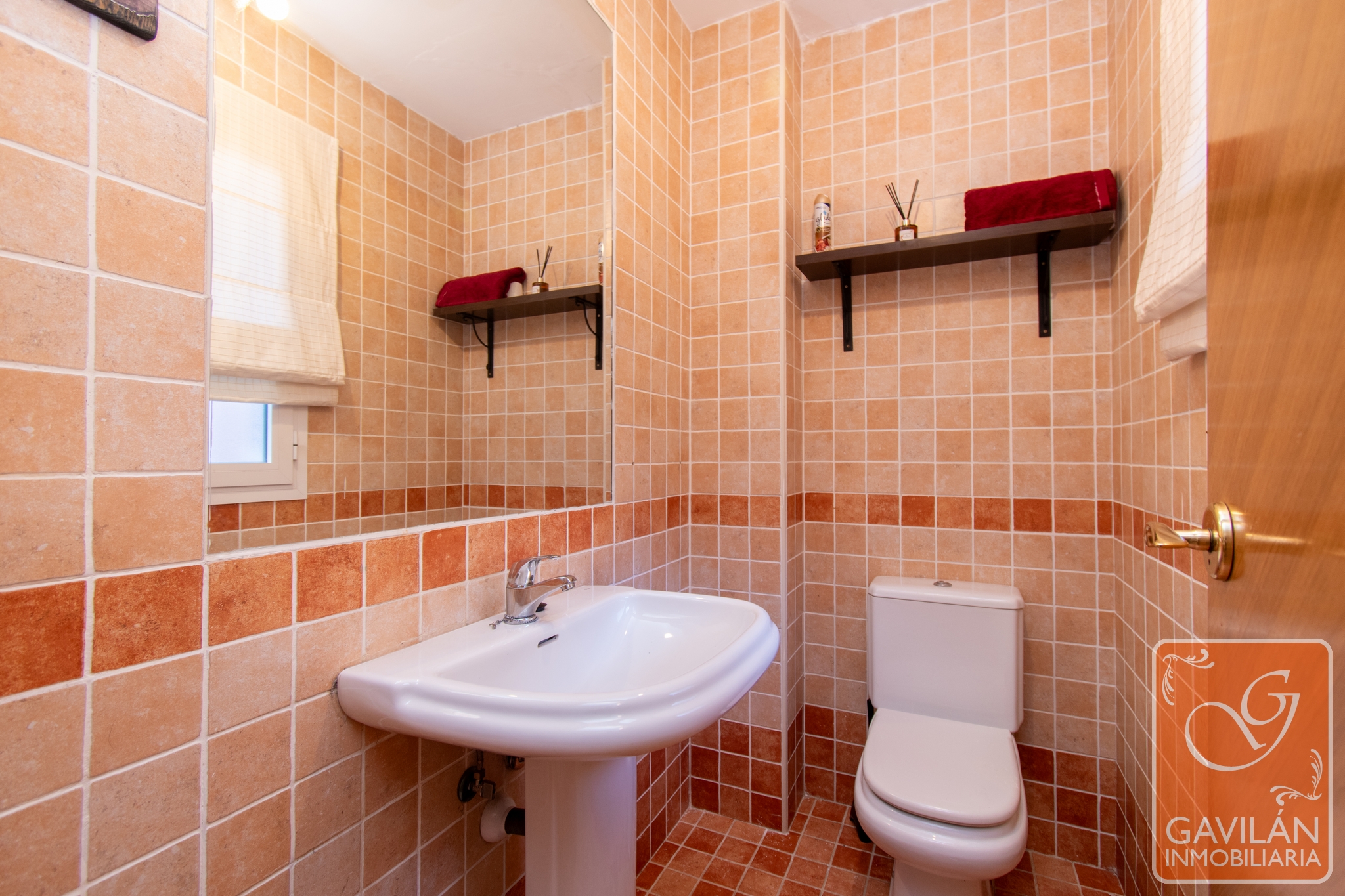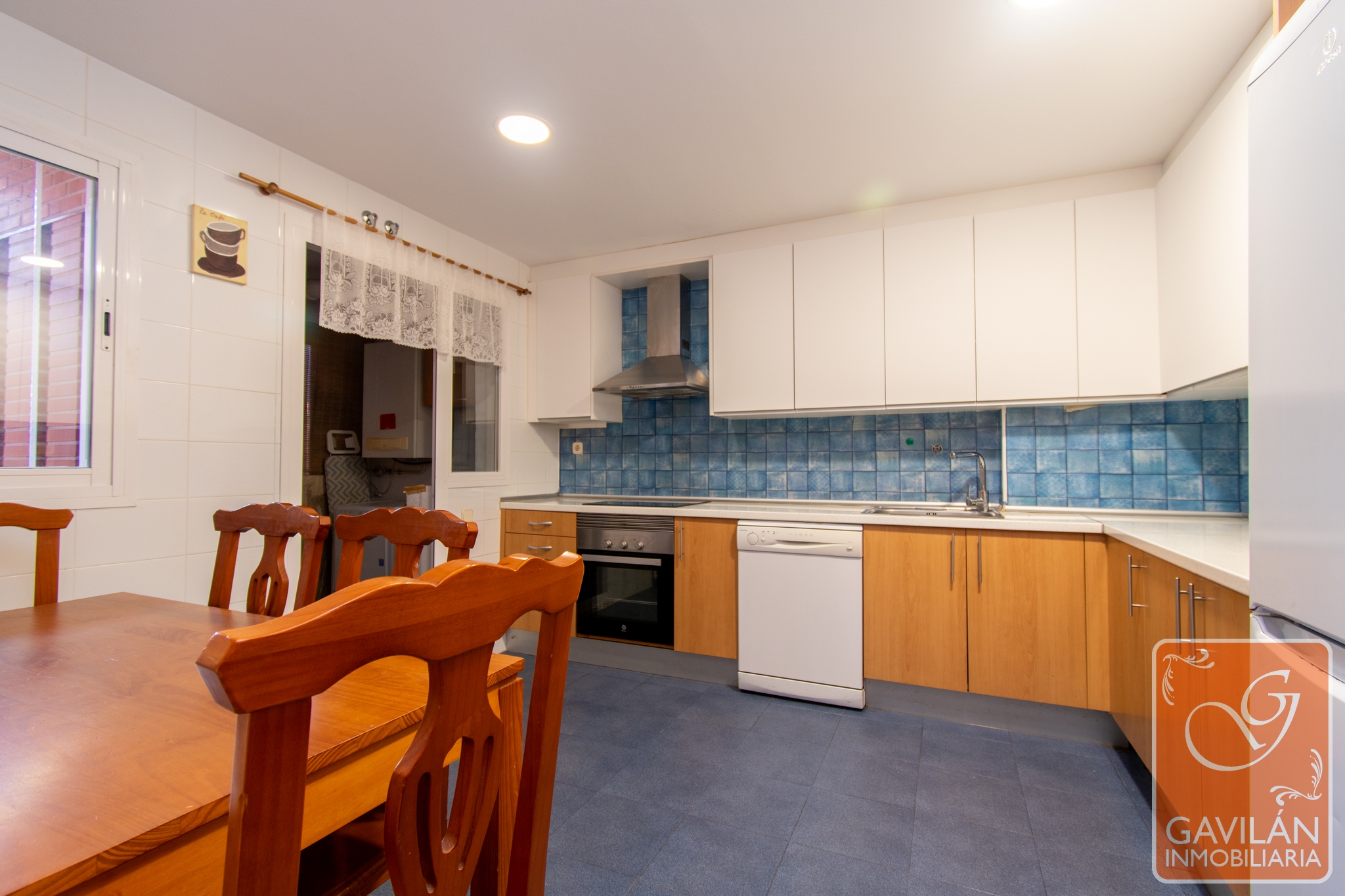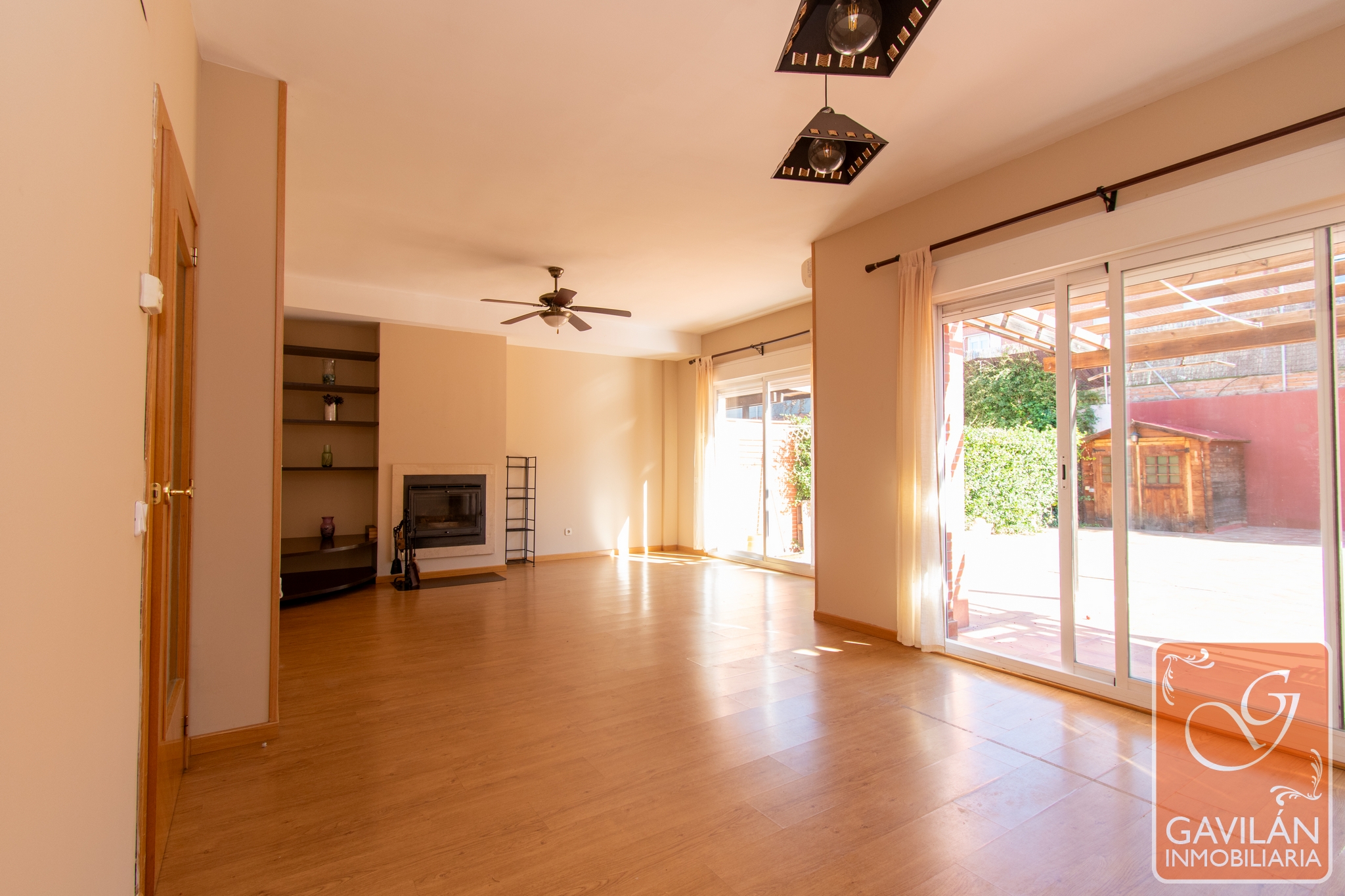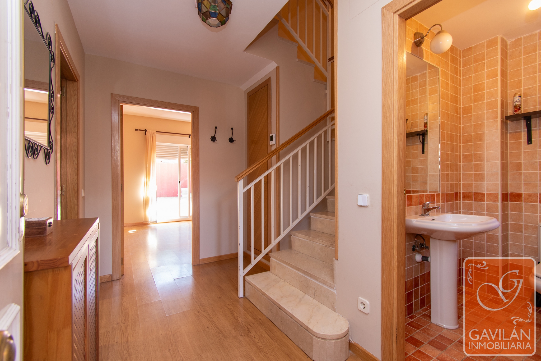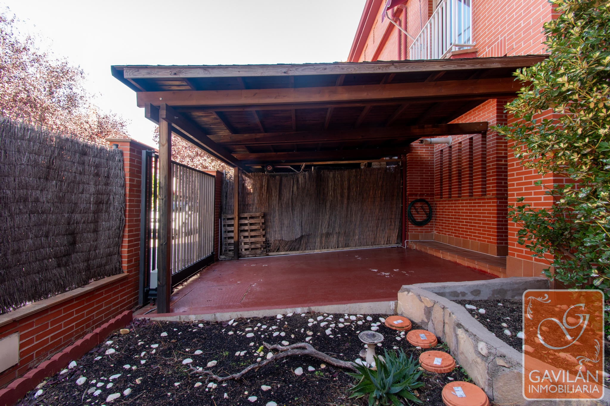 Esta fabulosa vivienda, lista para entrar a vivir cuenta con la siguiente distribución: Patio delantero de 33m² con zona de aparcamiento techado con puerta automática, porche cubierto y toma de agua. Hall recibidor con armario bajo escalera. Bonita cocina totalmente amueblada, equipada con electrodomésticos básicos y salida a lavadero. Luminoso salón comedor de 30m² dotado de chimenea con cassette y acceso al amplio jardín solado equipado con porche con toldo, caseta, iluminación y toma de agua. Disponemos de un aseo en esta planta.
