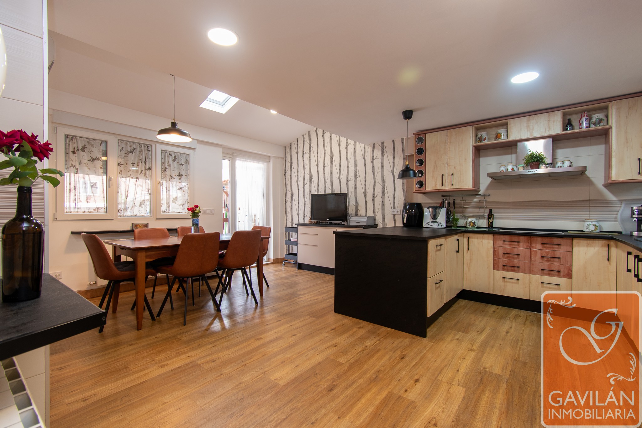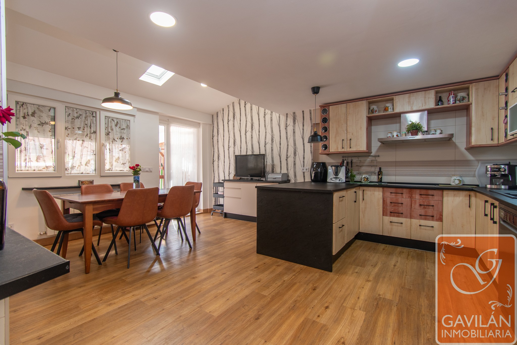 Desde el hall se accede a un aseo de cortesía equipado con lavabo con mueble y WC, perfecto para visitas. La cocina, totalmente reformada y ampliada hasta los 25 m², es un espacio luminoso y moderno, con acceso directo al jardín, y está equipada con campana, vitrocerámica, horno, A/A con bomba de calor, velux con persiana, y ventana con persiana automática, luces LED, haciendo de ella un lugar en el que disfrutar de reuniones con amigos o familiares.