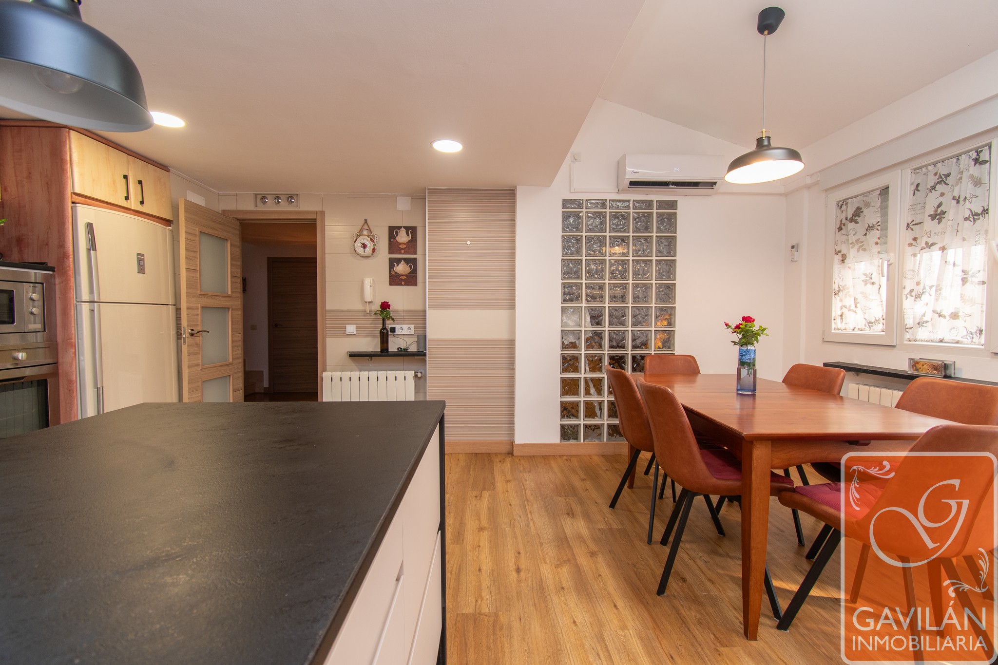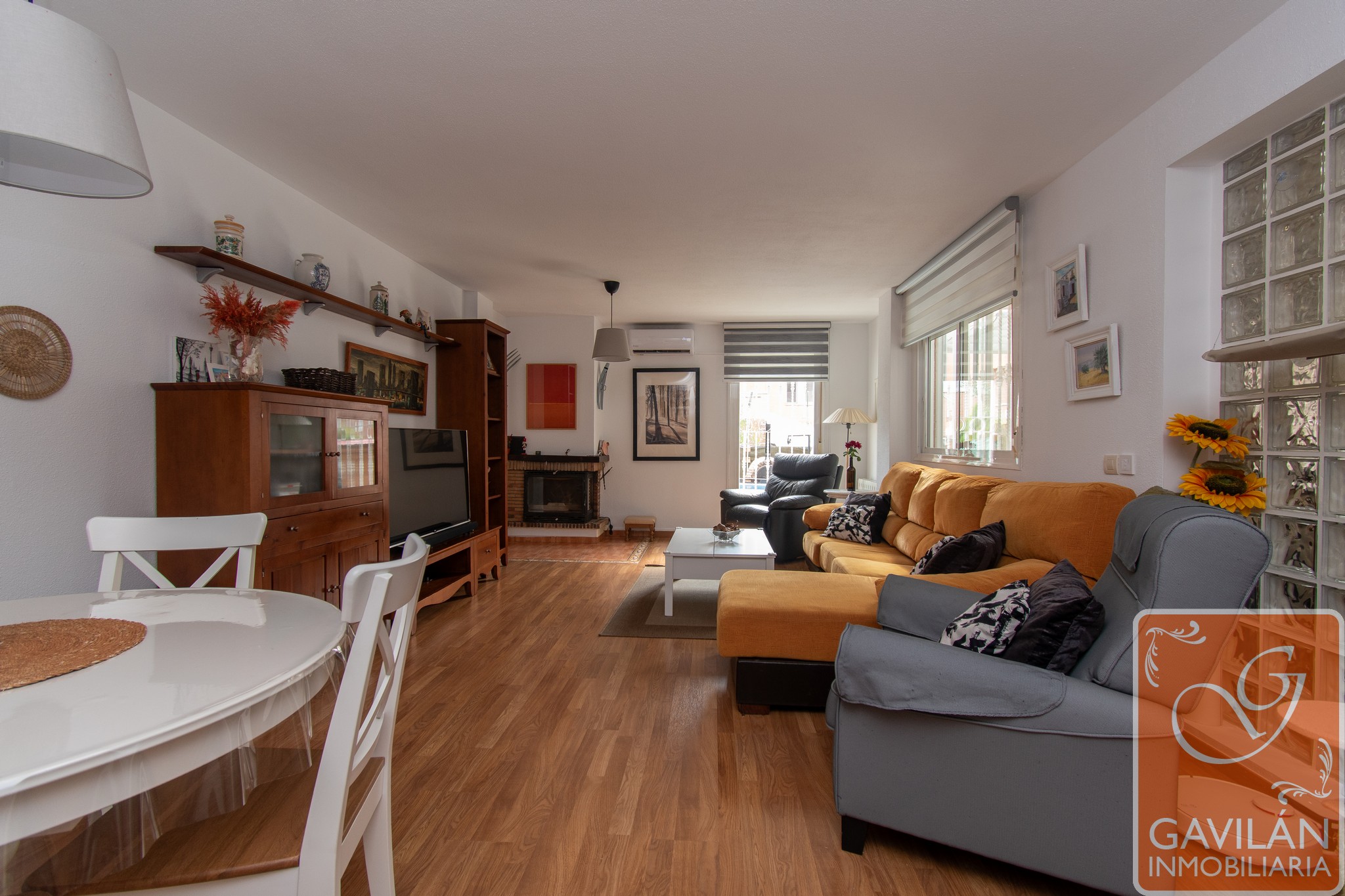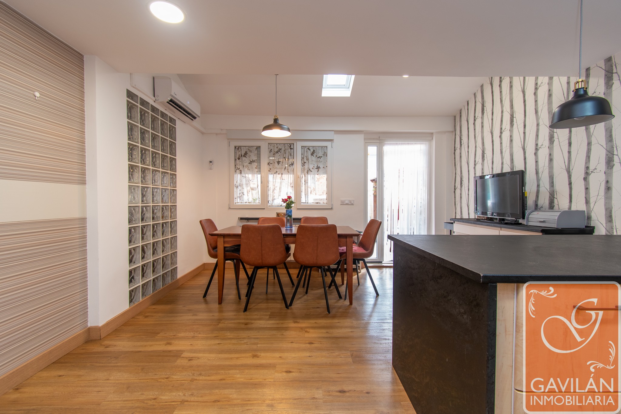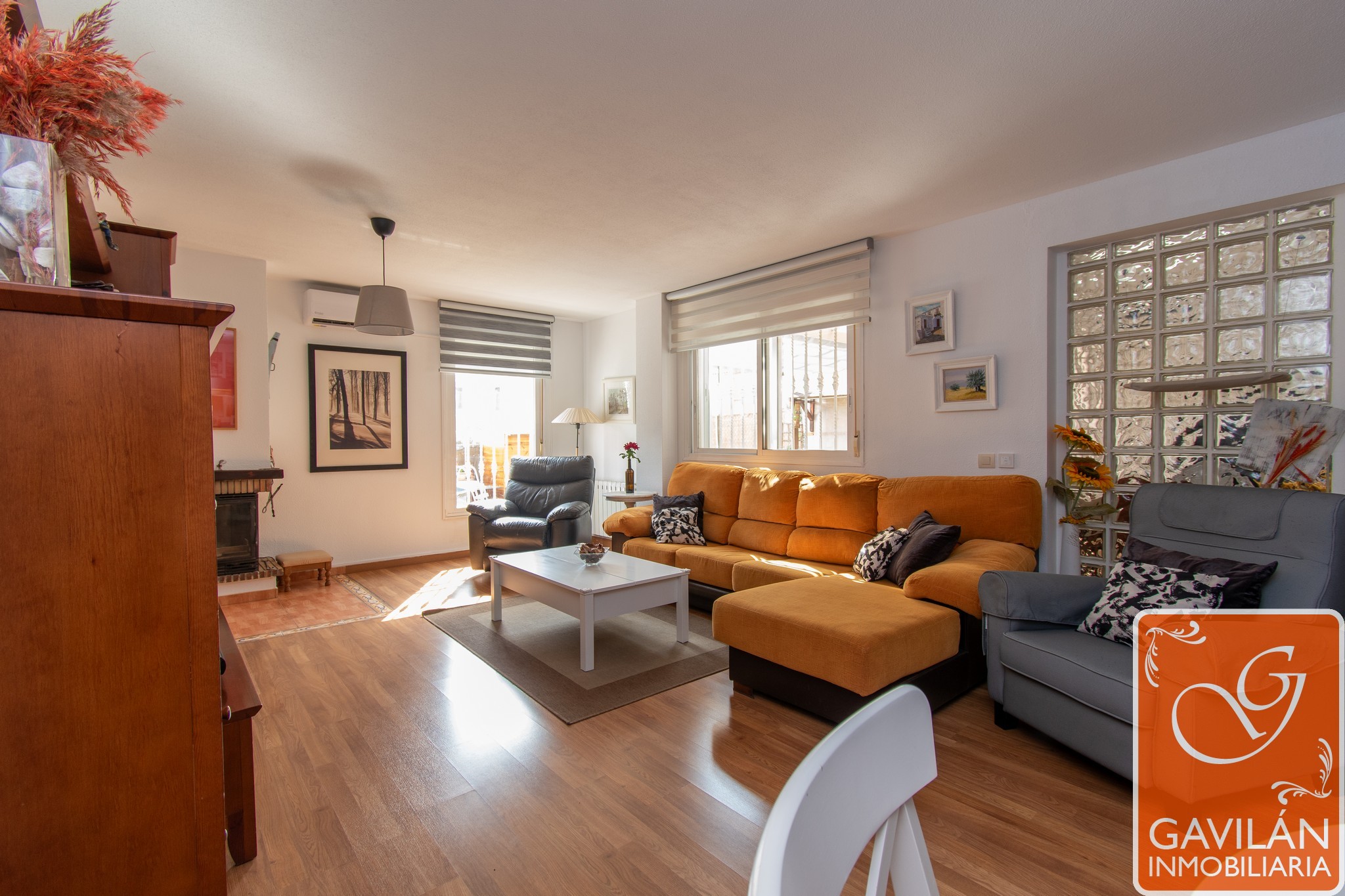 El salón, de 30m², es amplio y acogedor, con una chimenea con casete, A/A con bomba de calor y una preciosa pared de pavés decorativos que deja pasar luz desde la cocina.