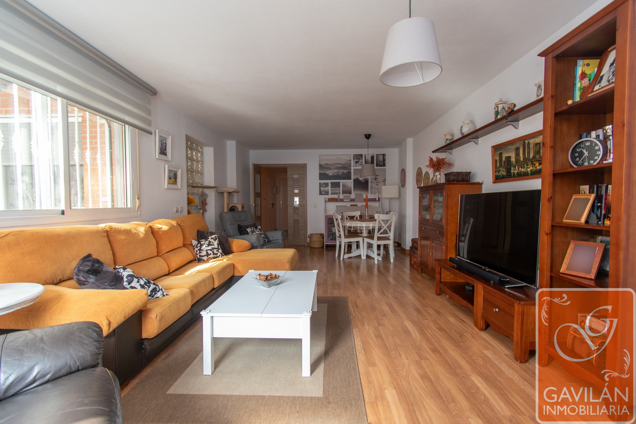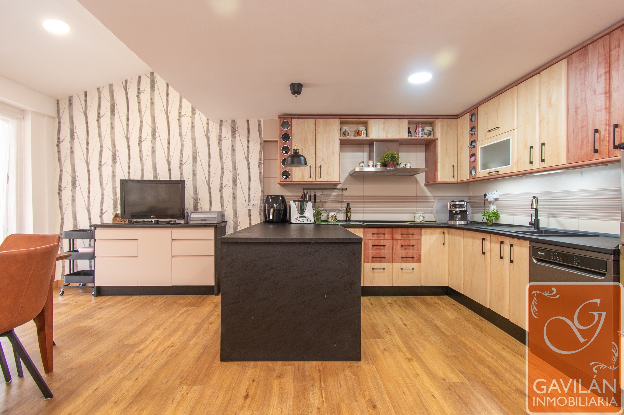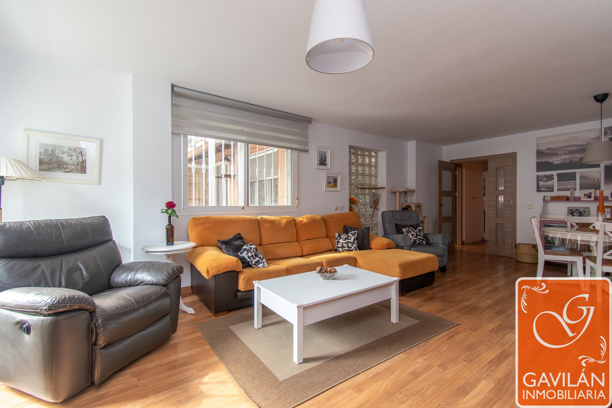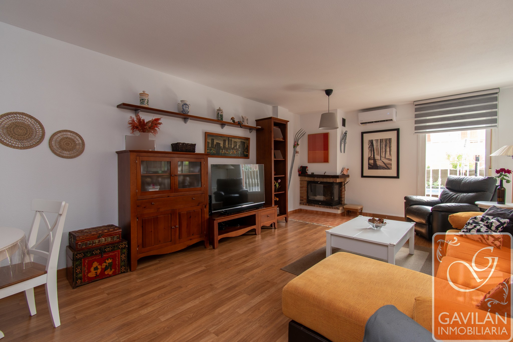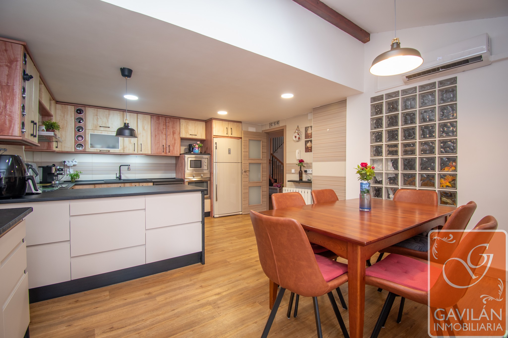 El salón, de 30m², es amplio y acogedor, con una chimenea con casete, A/A con bomba de calor y una preciosa pared de pavés decorativos que deja pasar luz desde la cocina.