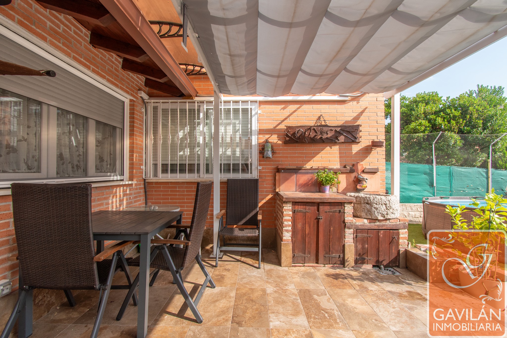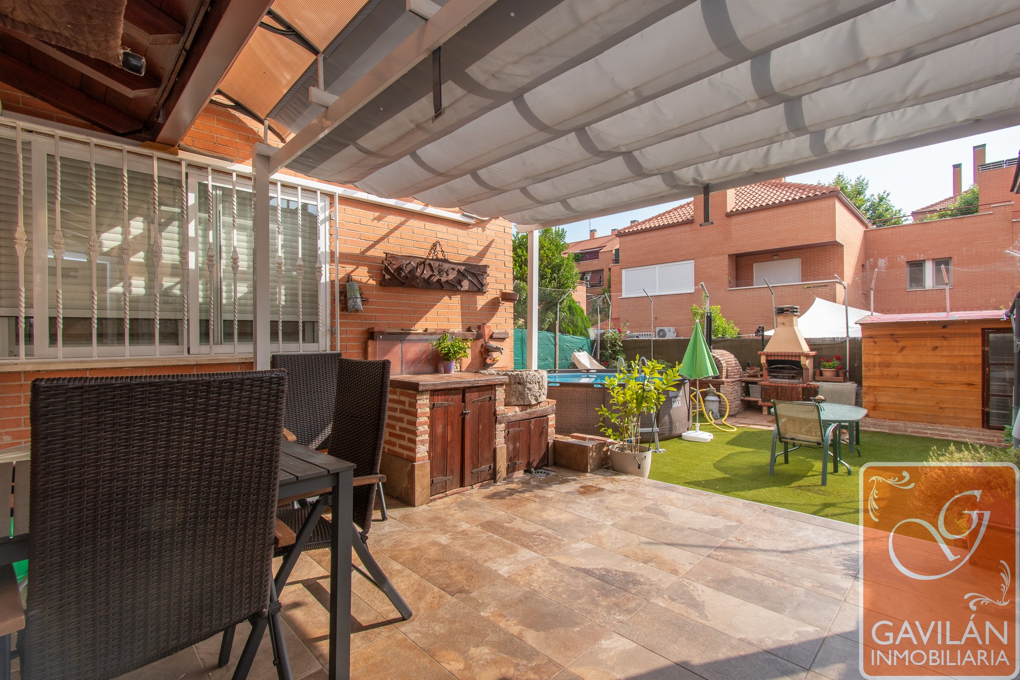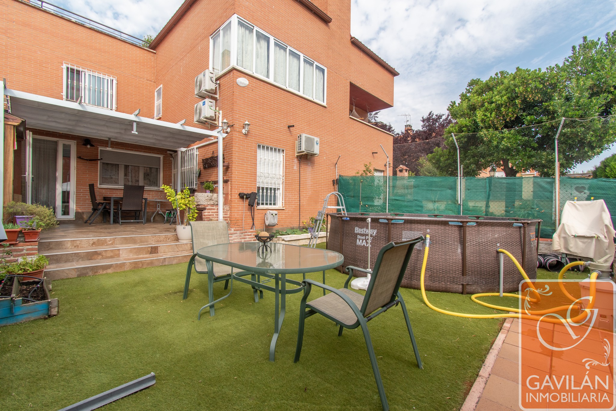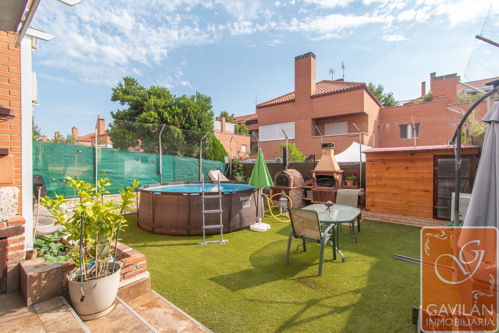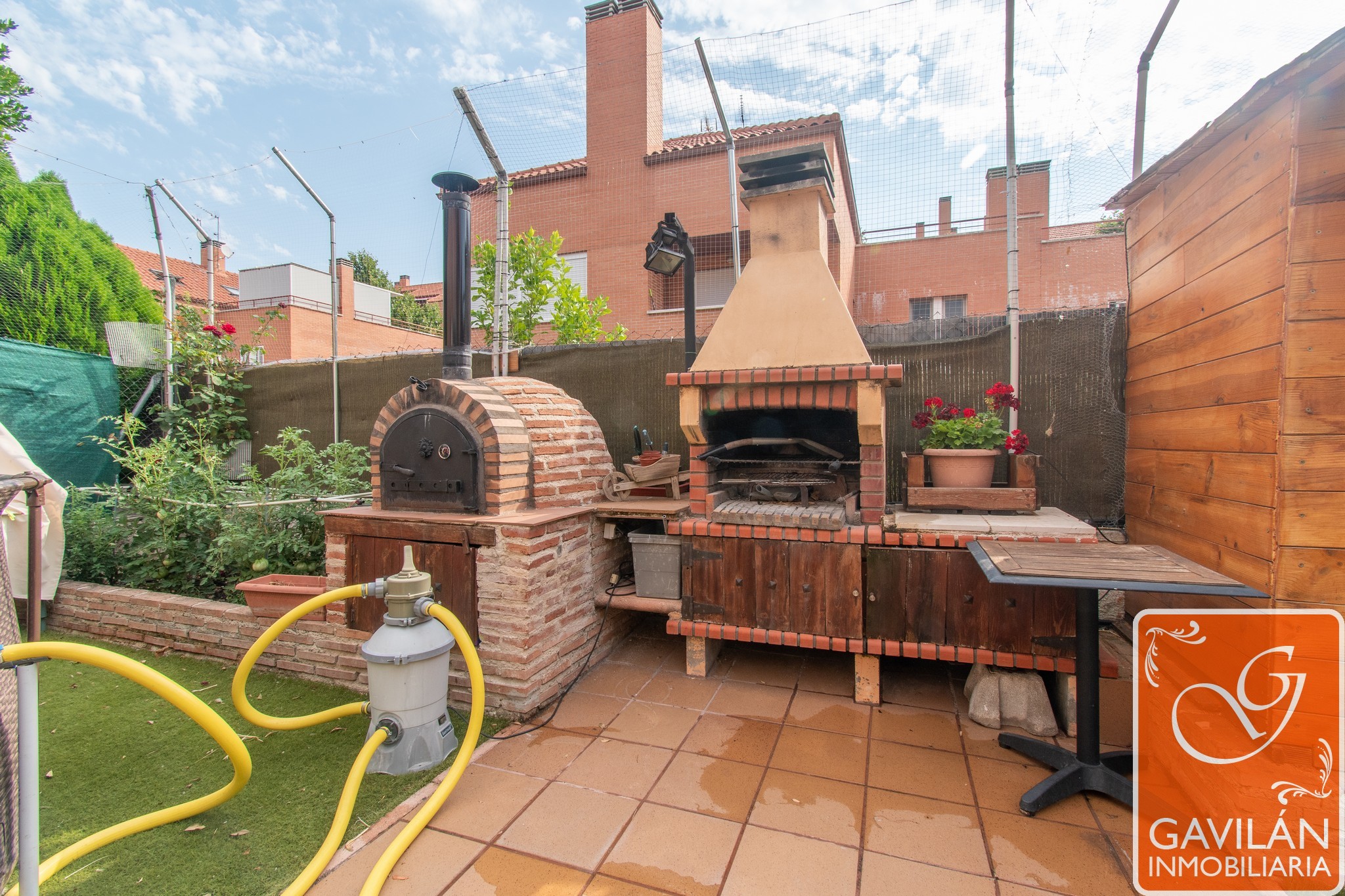 El jardín, de unos 95m², es uno de los grandes atractivos: cuenta con horno y barbacoa de obra, pérgola, caseta de madera, césped artificial, tomas de agua y desagüe para jardinería, riego automático, creando un espacio perfecto para disfrutar de la mejor compañía y ocio al aire libre.