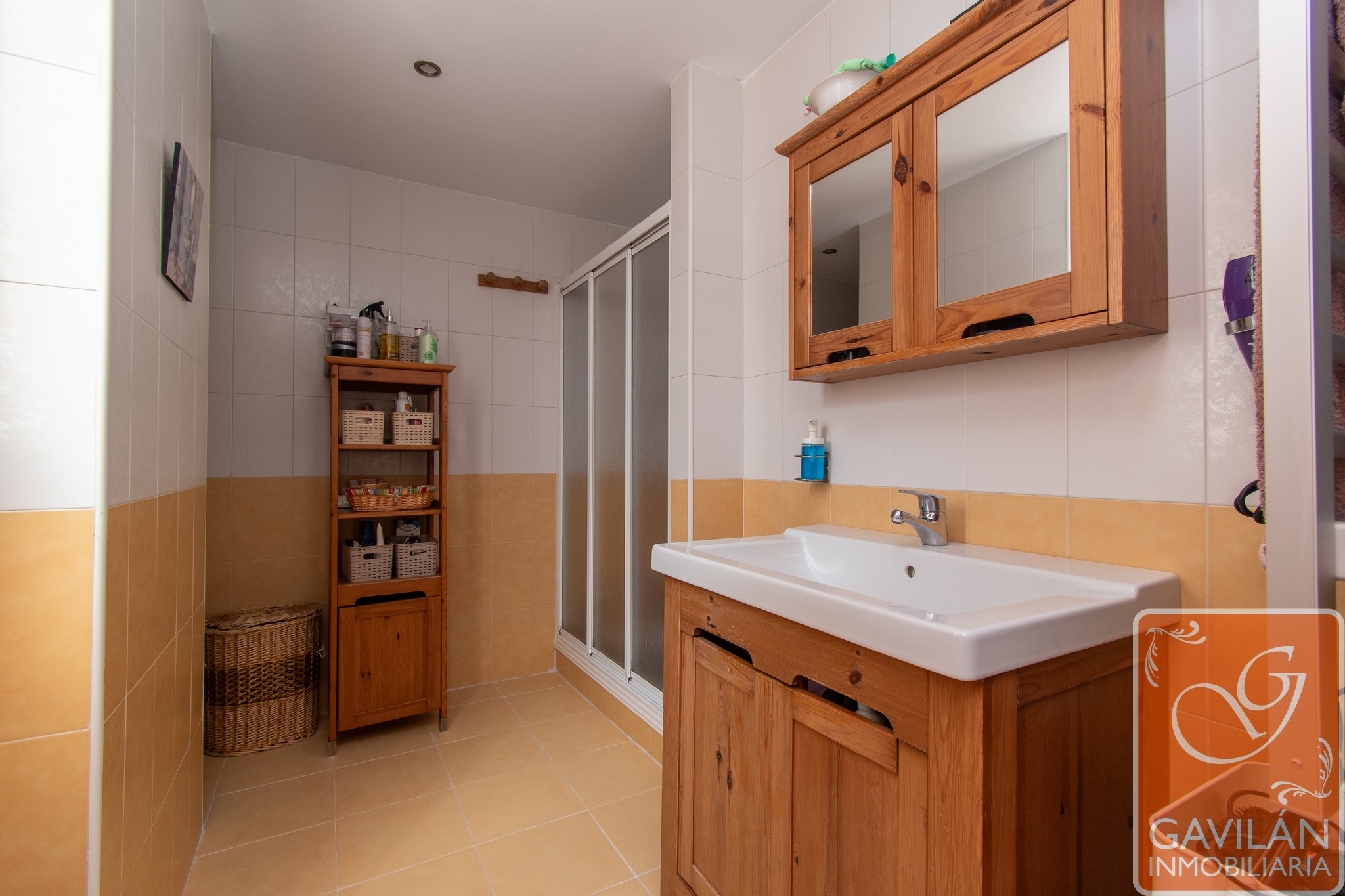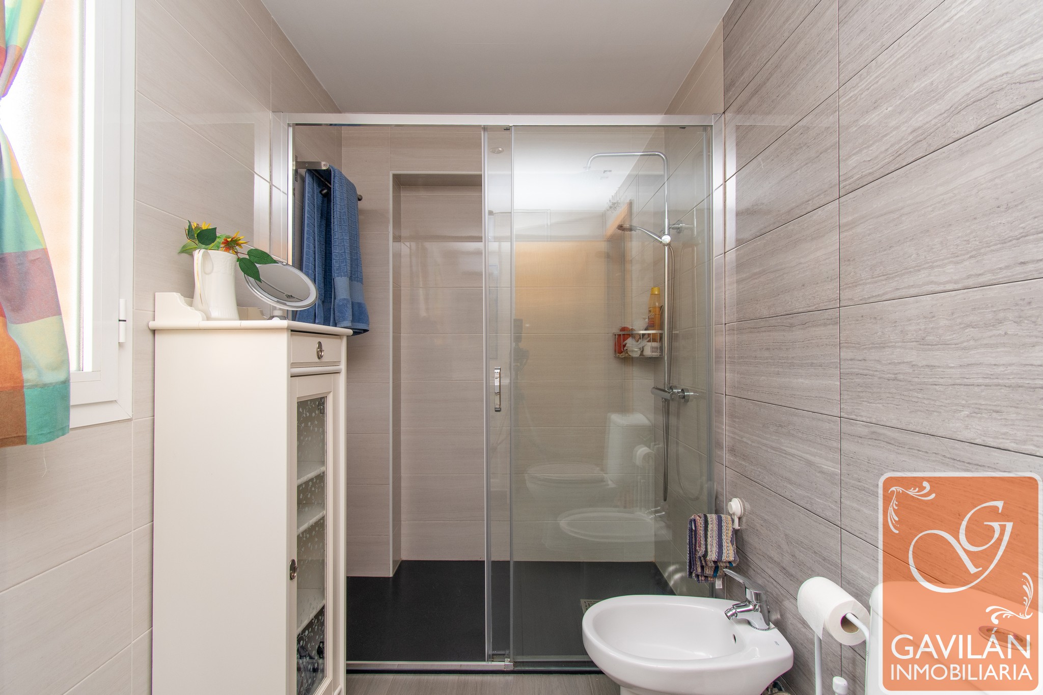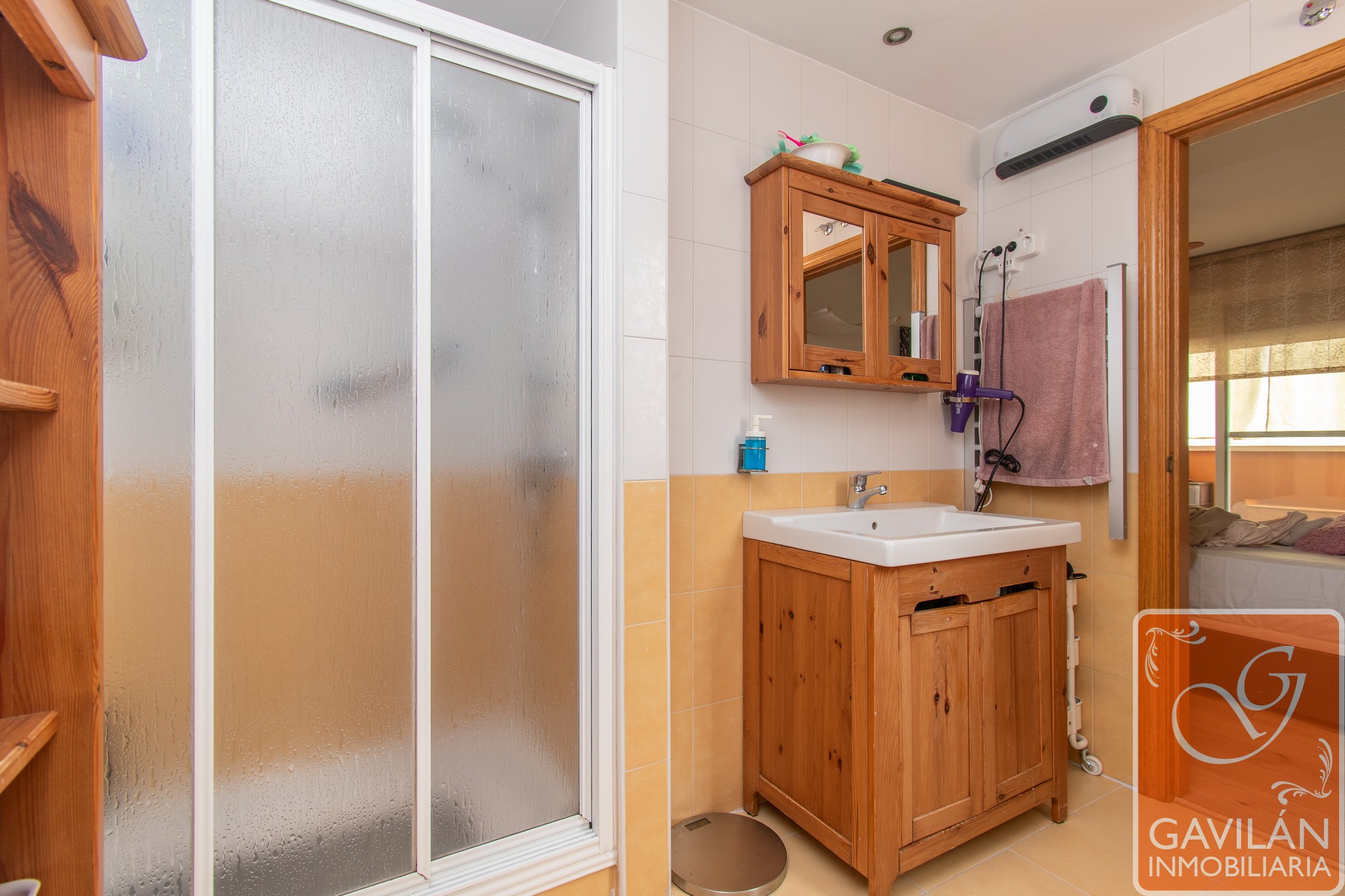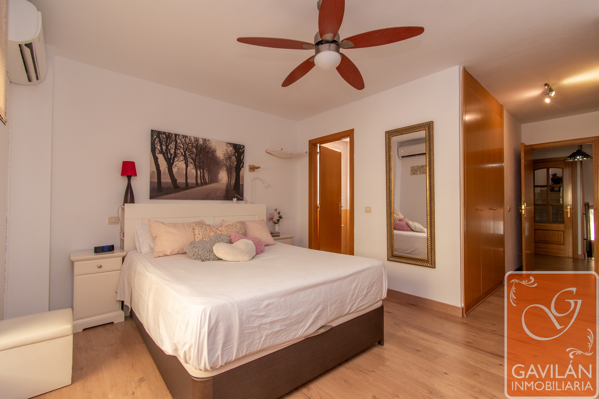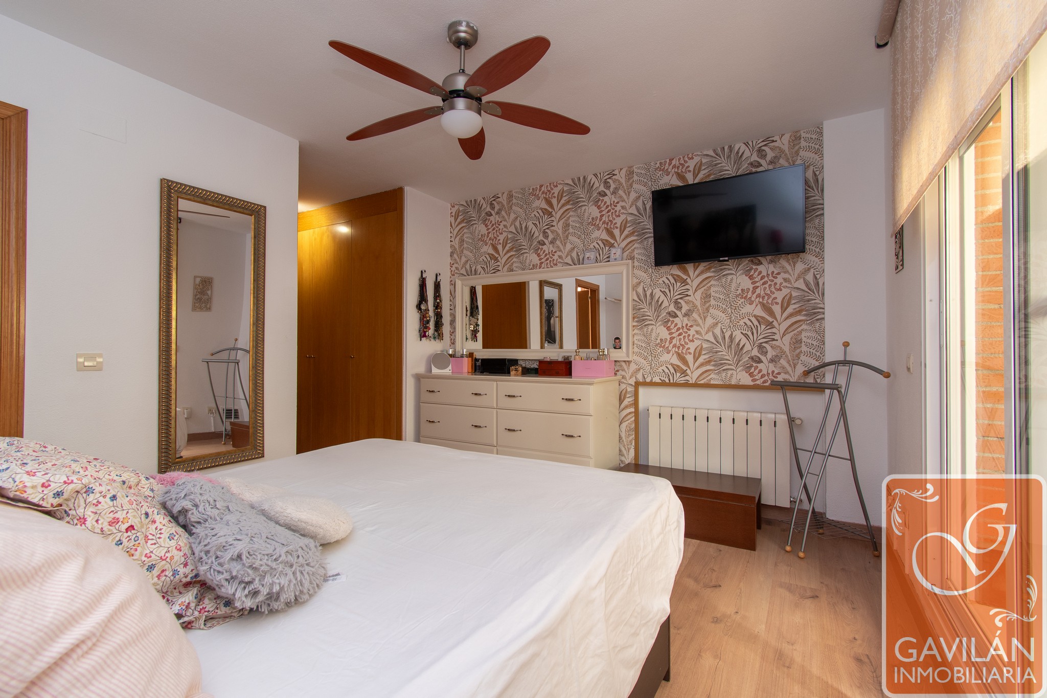 El pasillo de la planta superior conecta con las habitaciones, donde encontramos un dormitorio en suite de 13m² con acceso a una terraza de 5m², acristalada y con persiana automática, salida de aire procedente de la chimenea, además de un vestidor con armarios forrados y vestidos. El baño en suite, de 7m² con una distribución muy especial e íntima, cuenta con lavabo, ducha con mampara, WC, bidet y ventana.