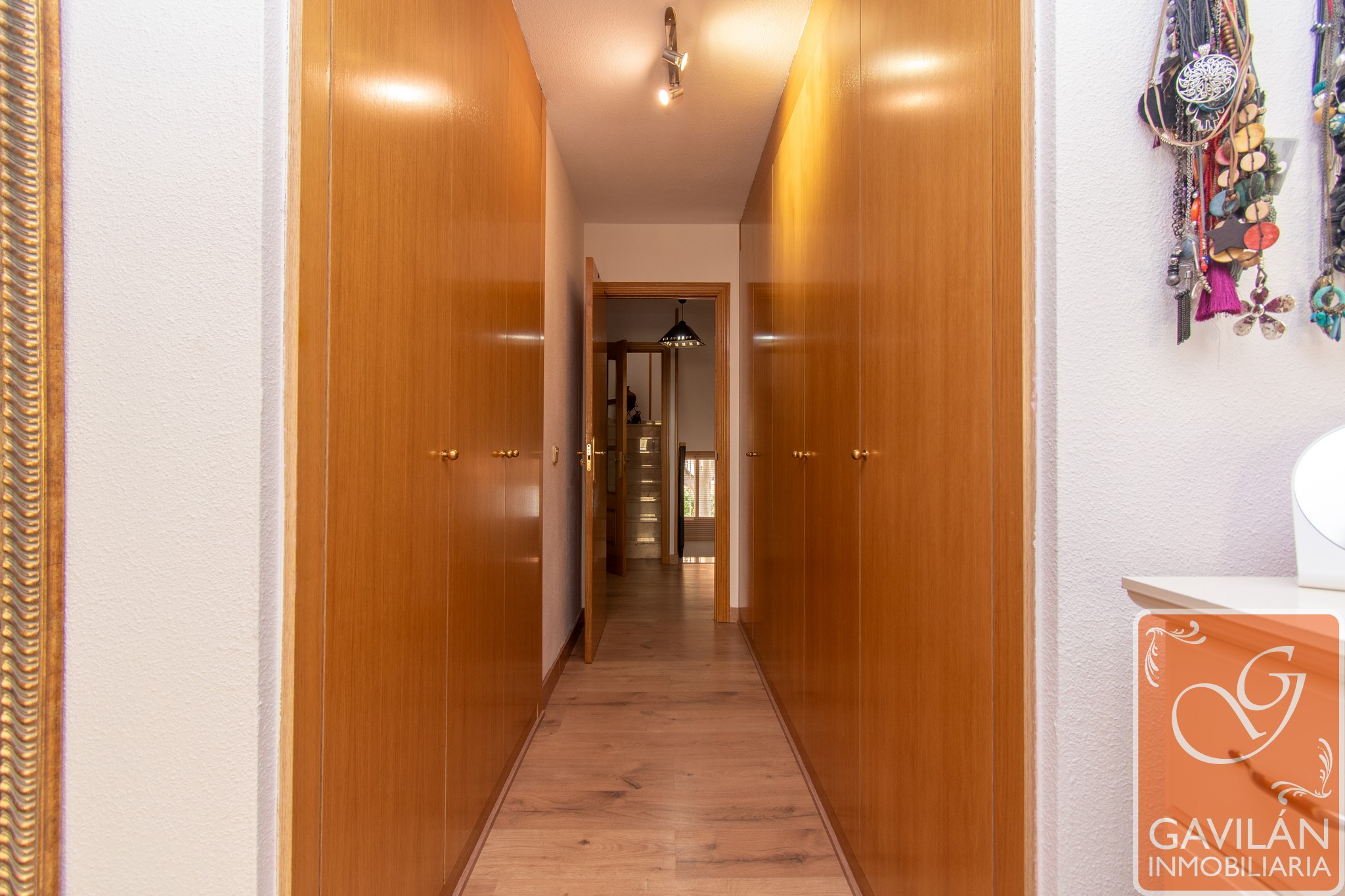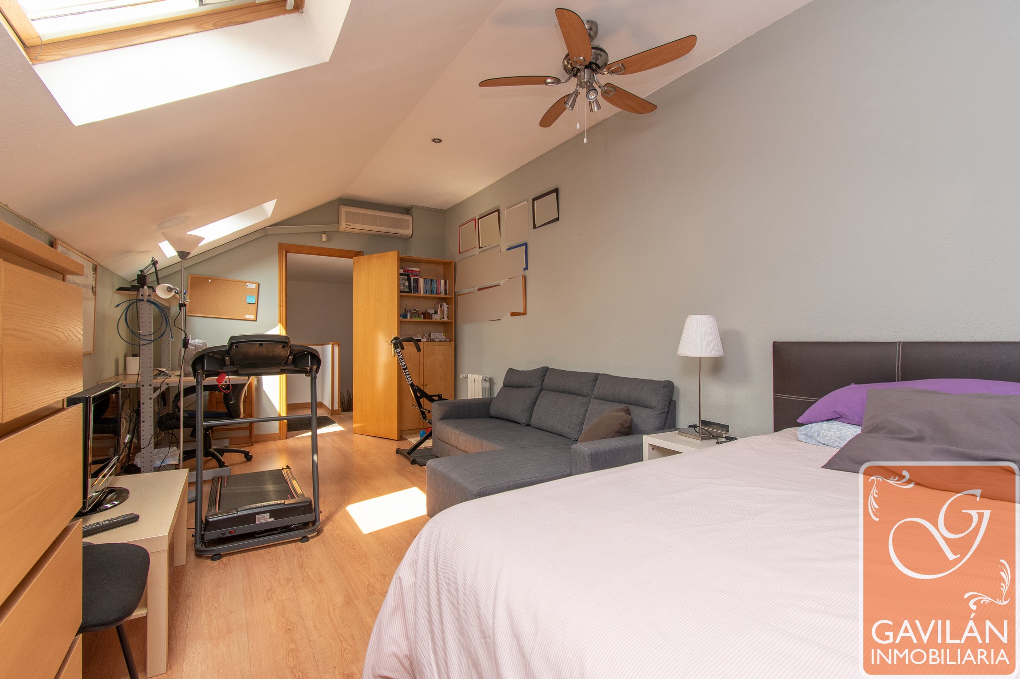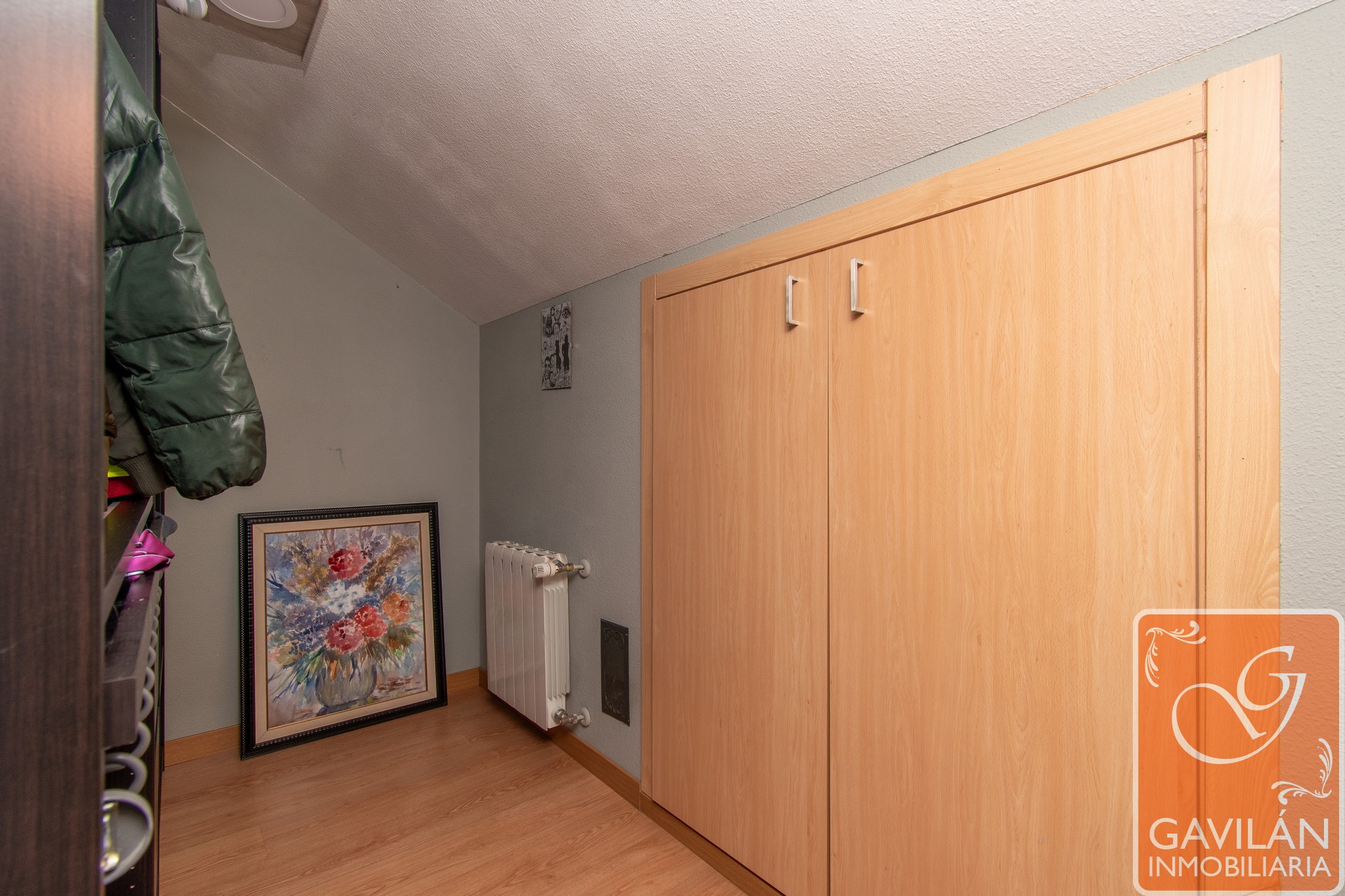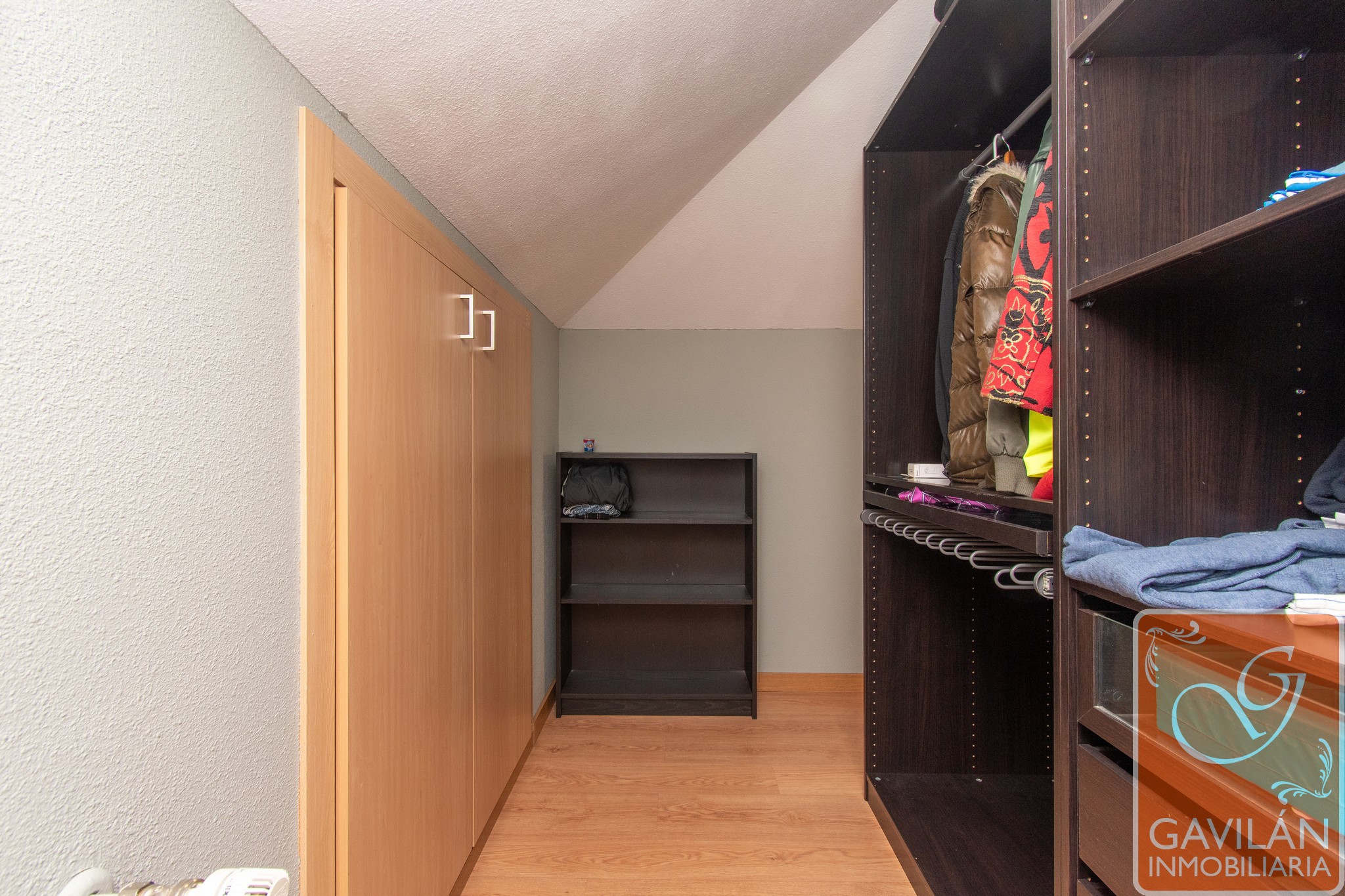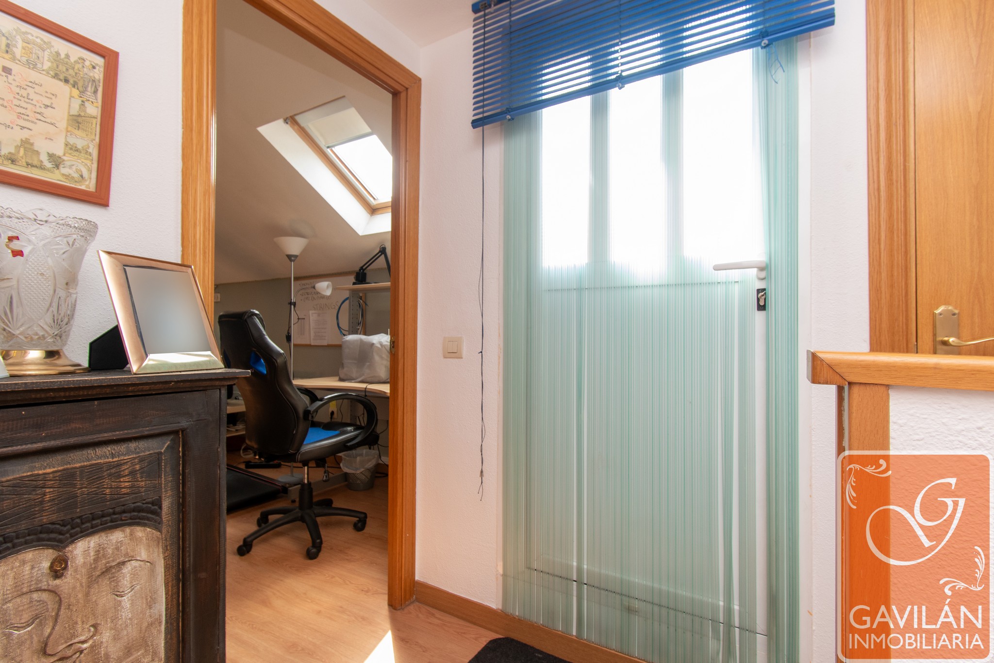 Desde el distribuidor se accede a la zona superior, y desde aquí a la buhardilla, que ofrece espacio adicional para almacenamiento o uso como sala de juegos o despacho.