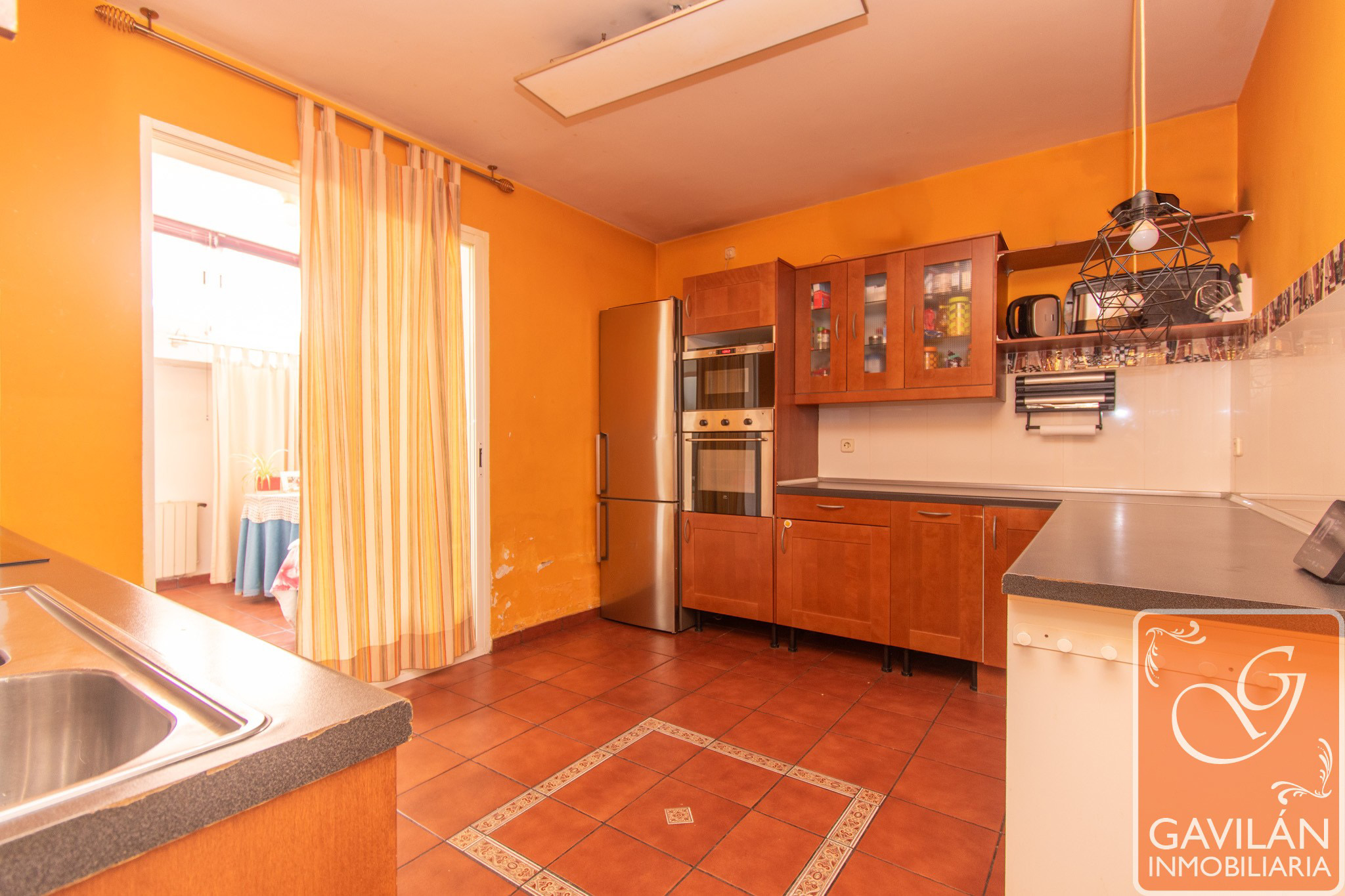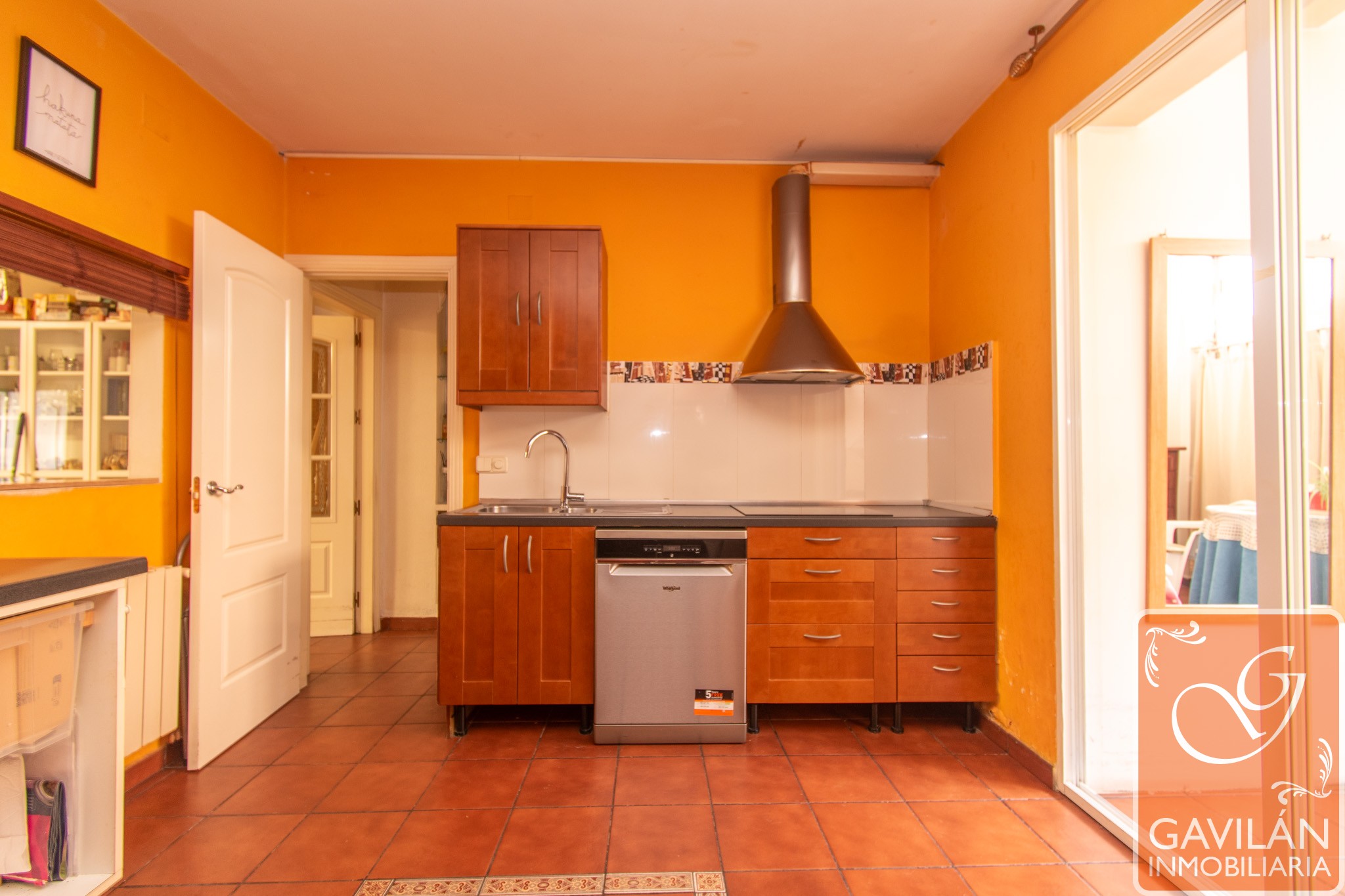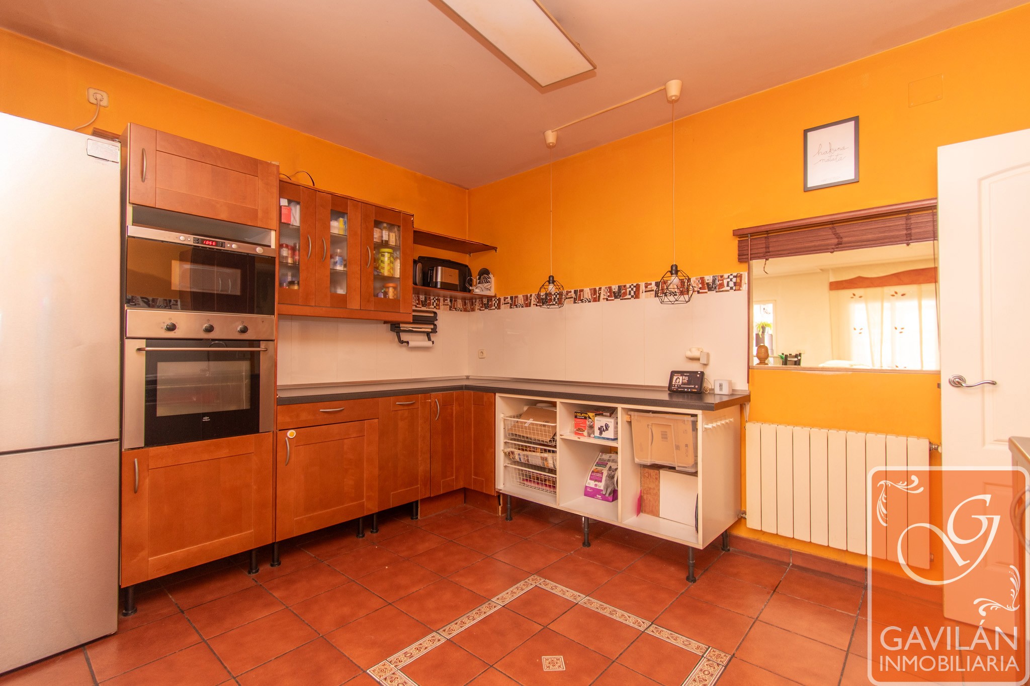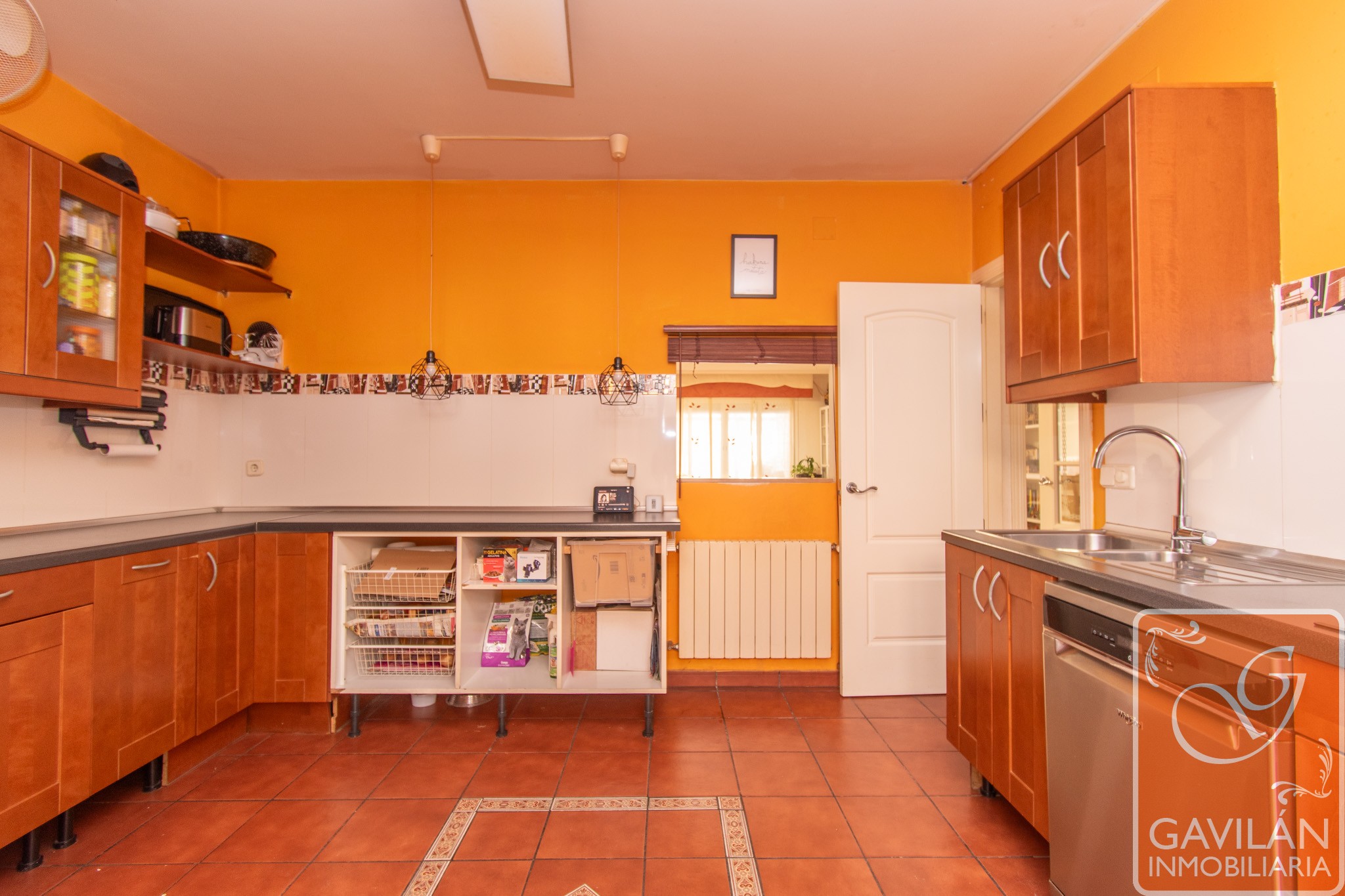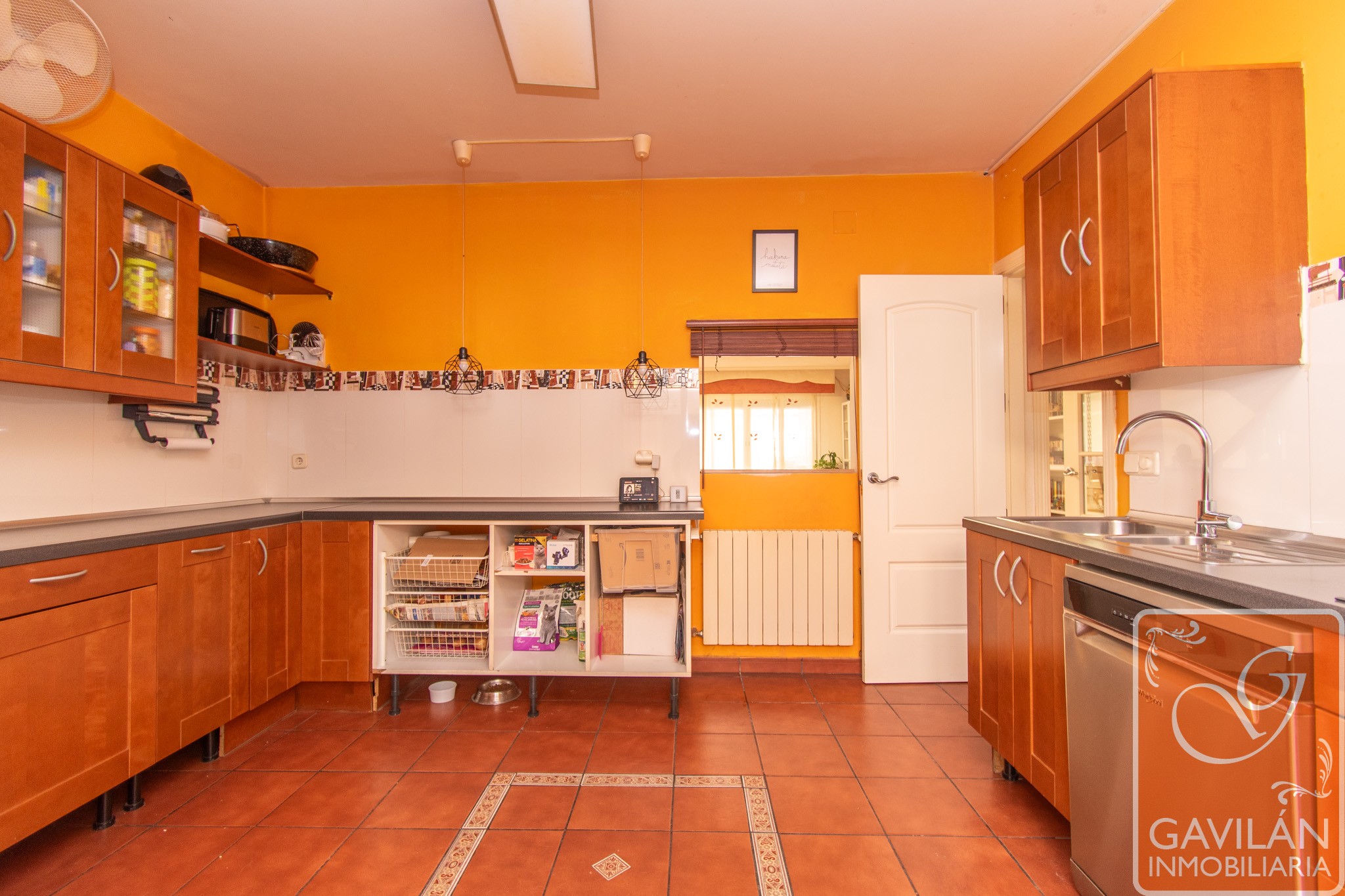 En el interior, encontramos un salón de 37 m² con chimenea, muy luminoso y con pasaplatos a la cocina. La cocina, totalmente equipada con muebles altos y bajos, vitrocerámica, horno, campana de acero y microondas, tiene salida a un patio trasero de 9,65 m², actualmente cerrado y acondicionado como dormitorio. Dispone además de zona de lavadero acristalada (6 m²) con lavadora, caldera de gasóleo (seminueva, 2 años) y depósito.