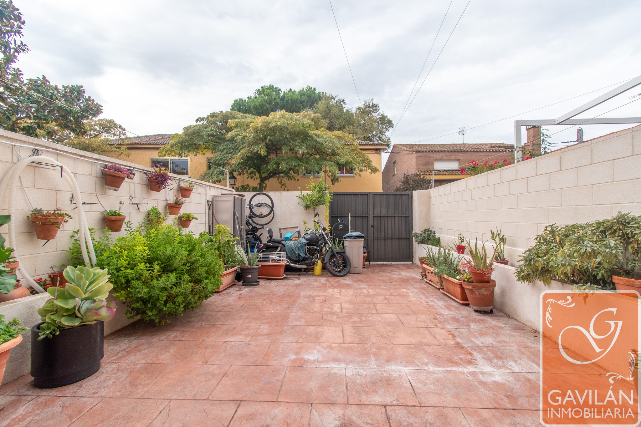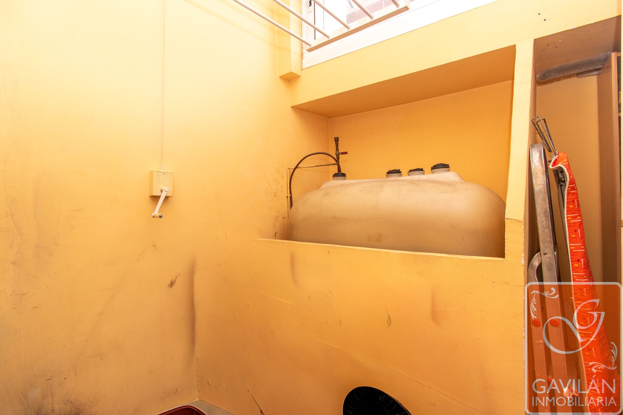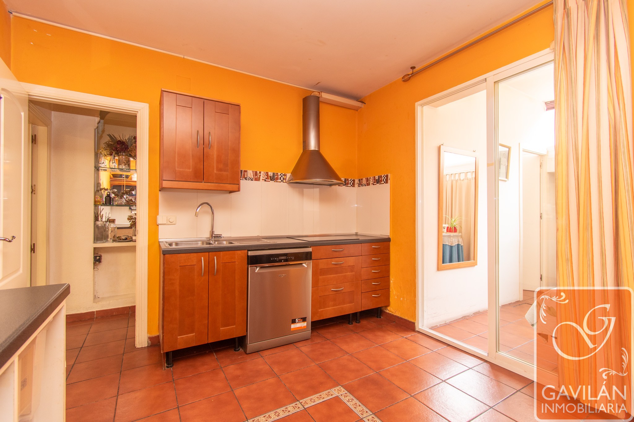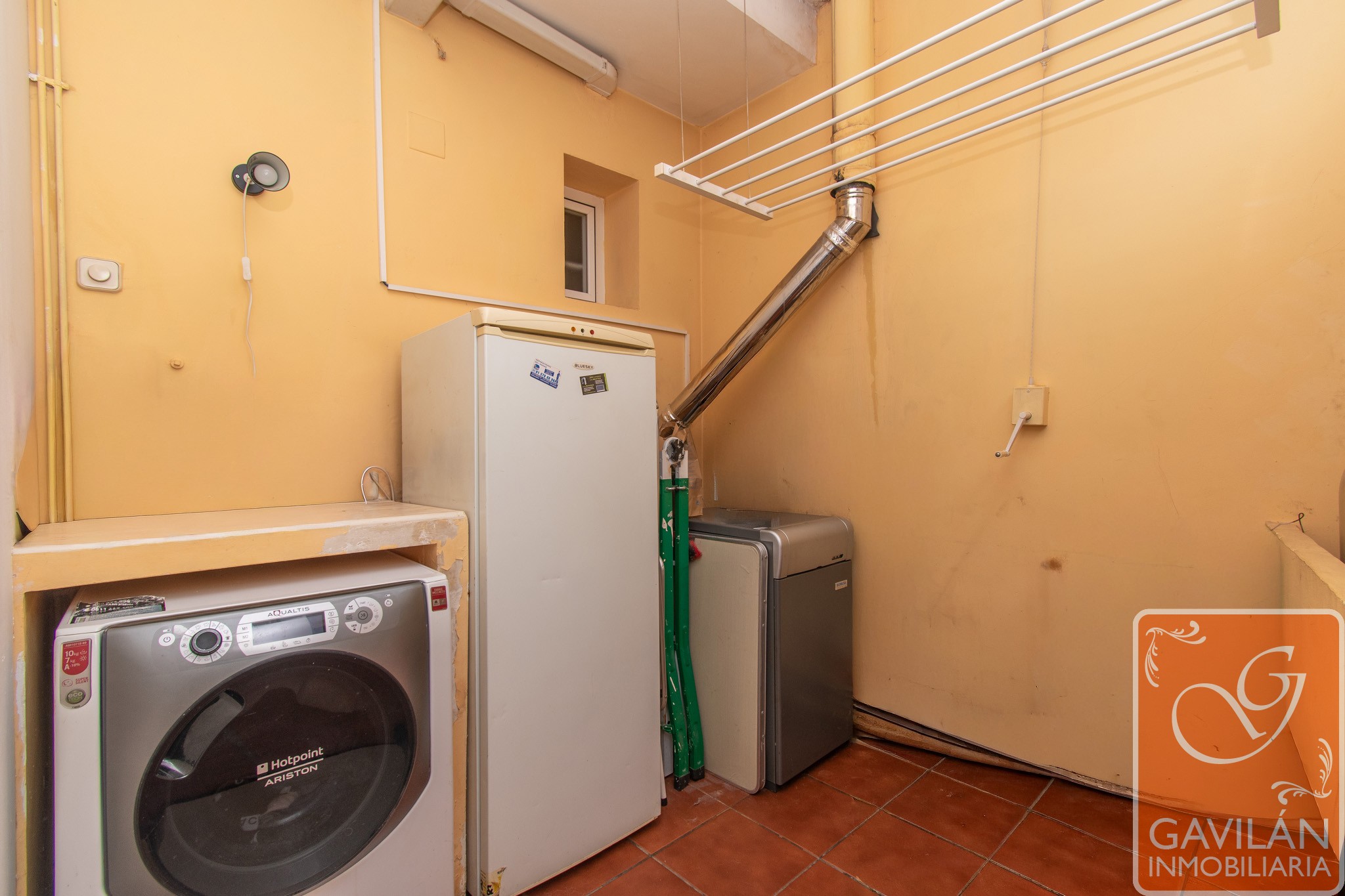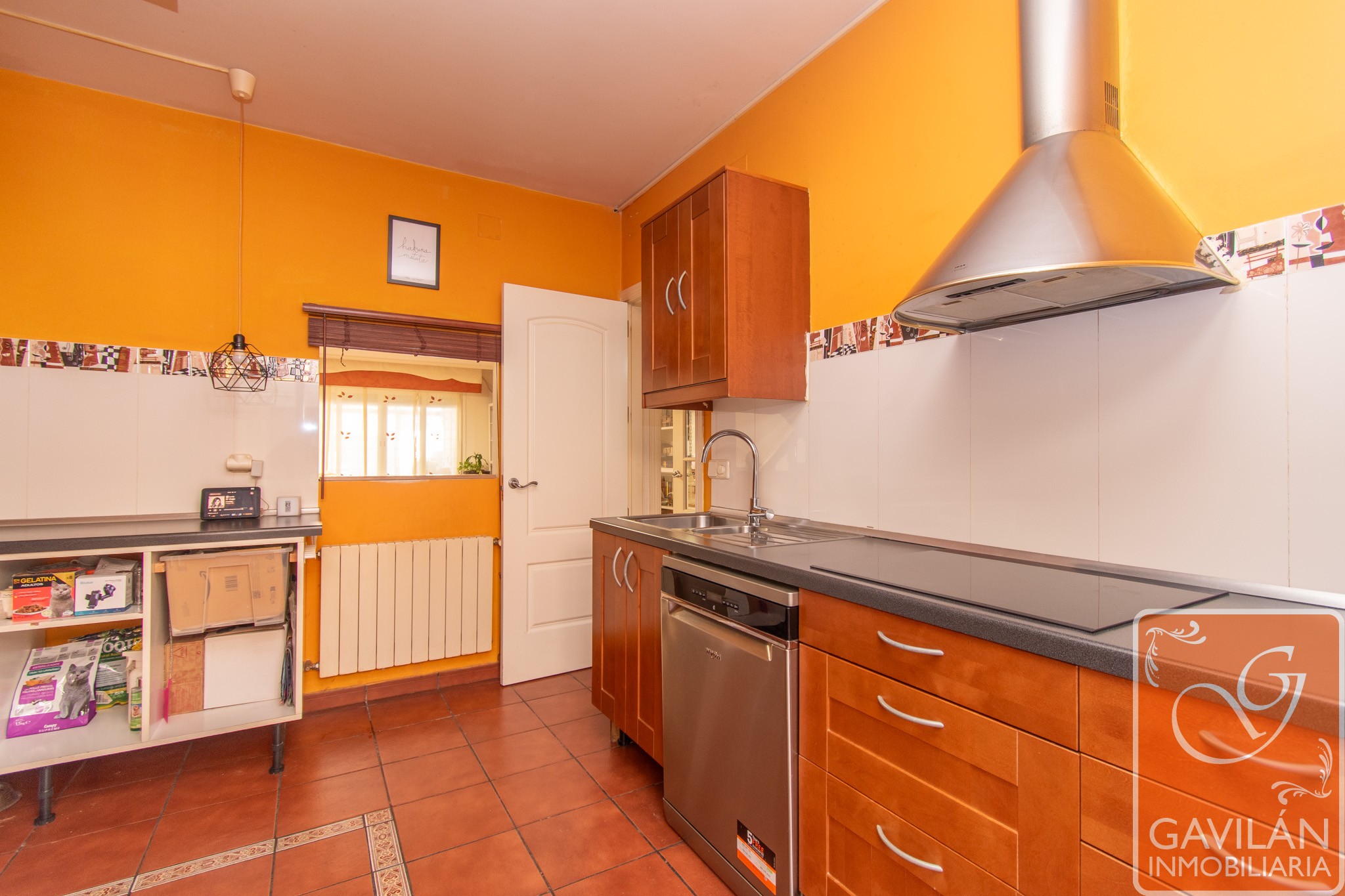 En el interior, encontramos un salón de 37 m² con chimenea, muy luminoso y con pasaplatos a la cocina. La cocina, totalmente equipada con muebles altos y bajos, vitrocerámica, horno, campana de acero y microondas, tiene salida a un patio trasero de 9,65 m², actualmente cerrado y acondicionado como dormitorio. Dispone además de zona de lavadero acristalada (6 m²) con lavadora, caldera de gasóleo (seminueva, 2 años) y depósito.