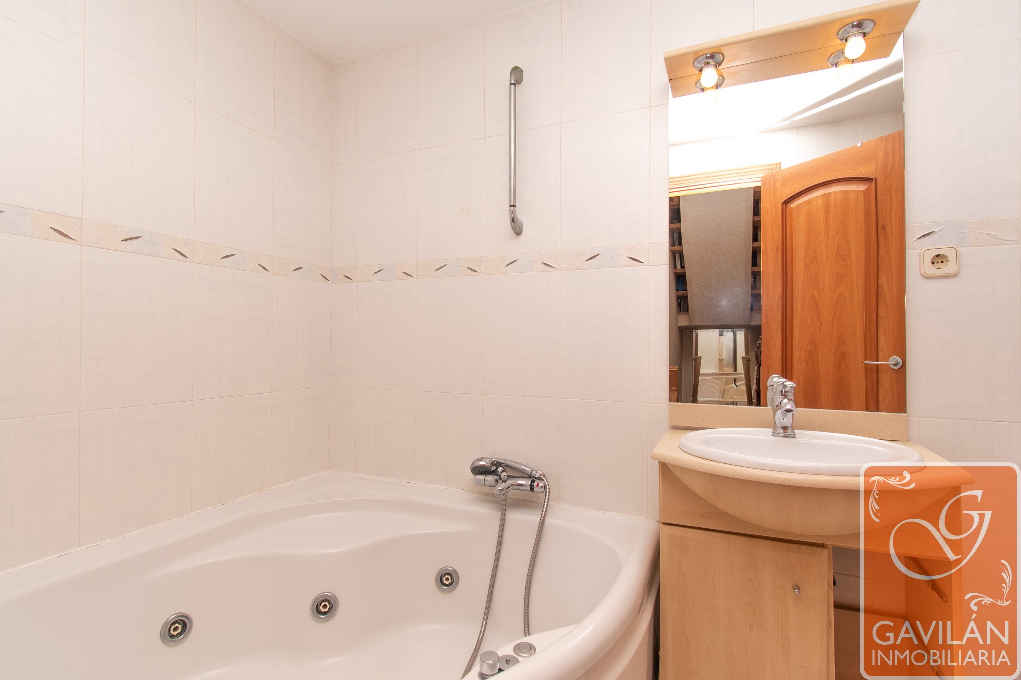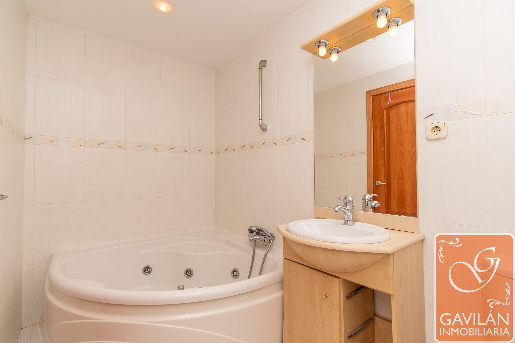 El baño principal cuenta con jacuzzi hidromasaje, mueble lavabo con espejo iluminado, radiador-toallero y ventana exterior.