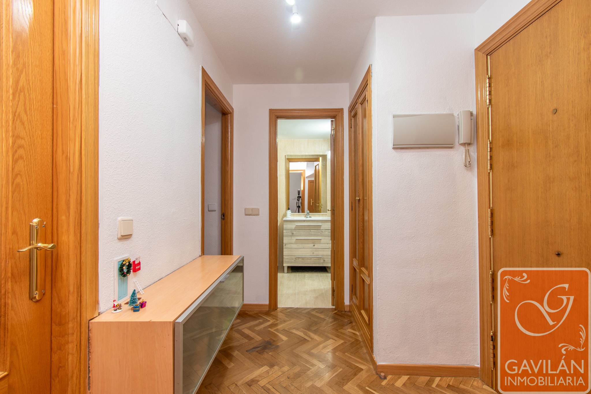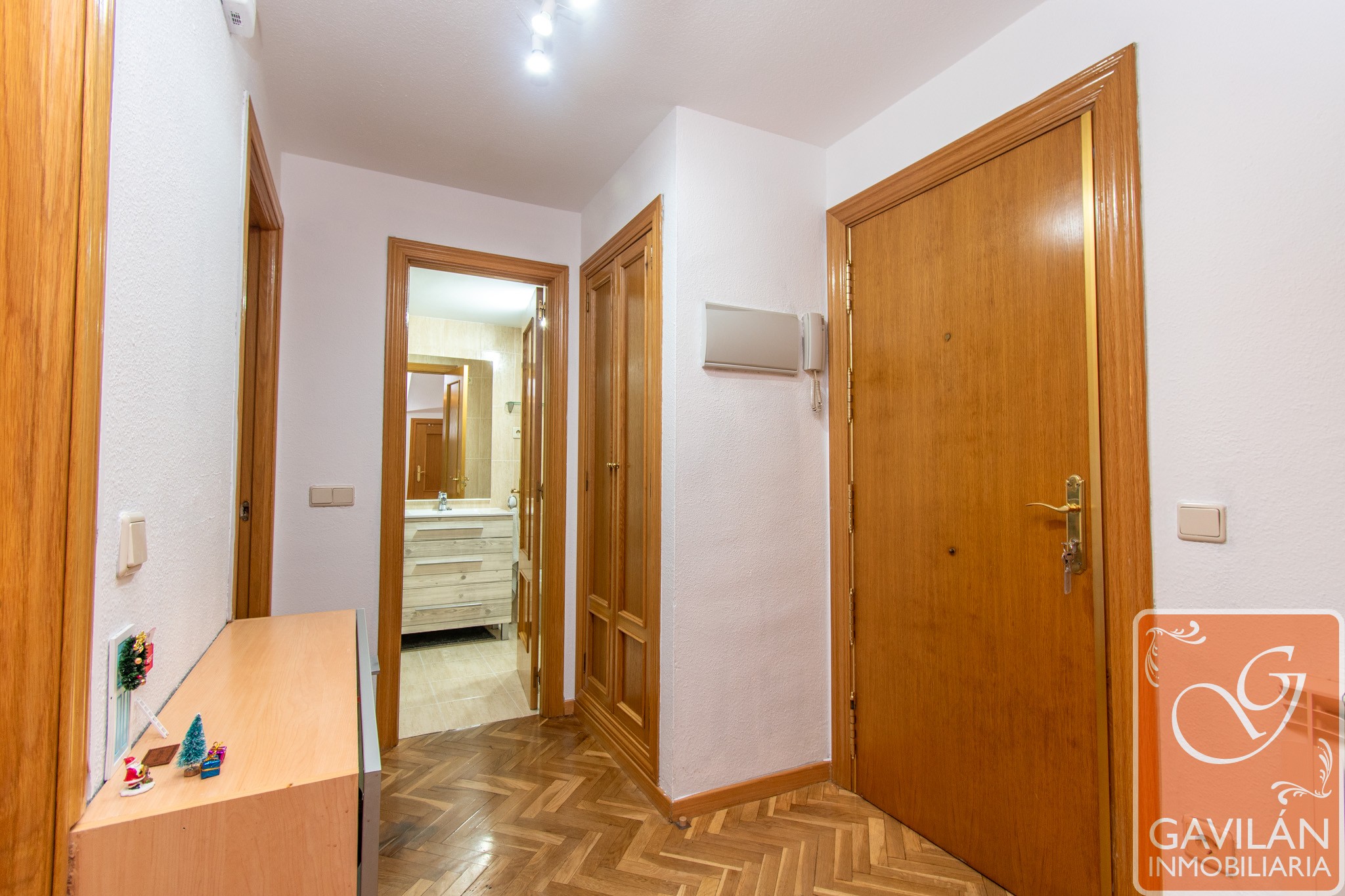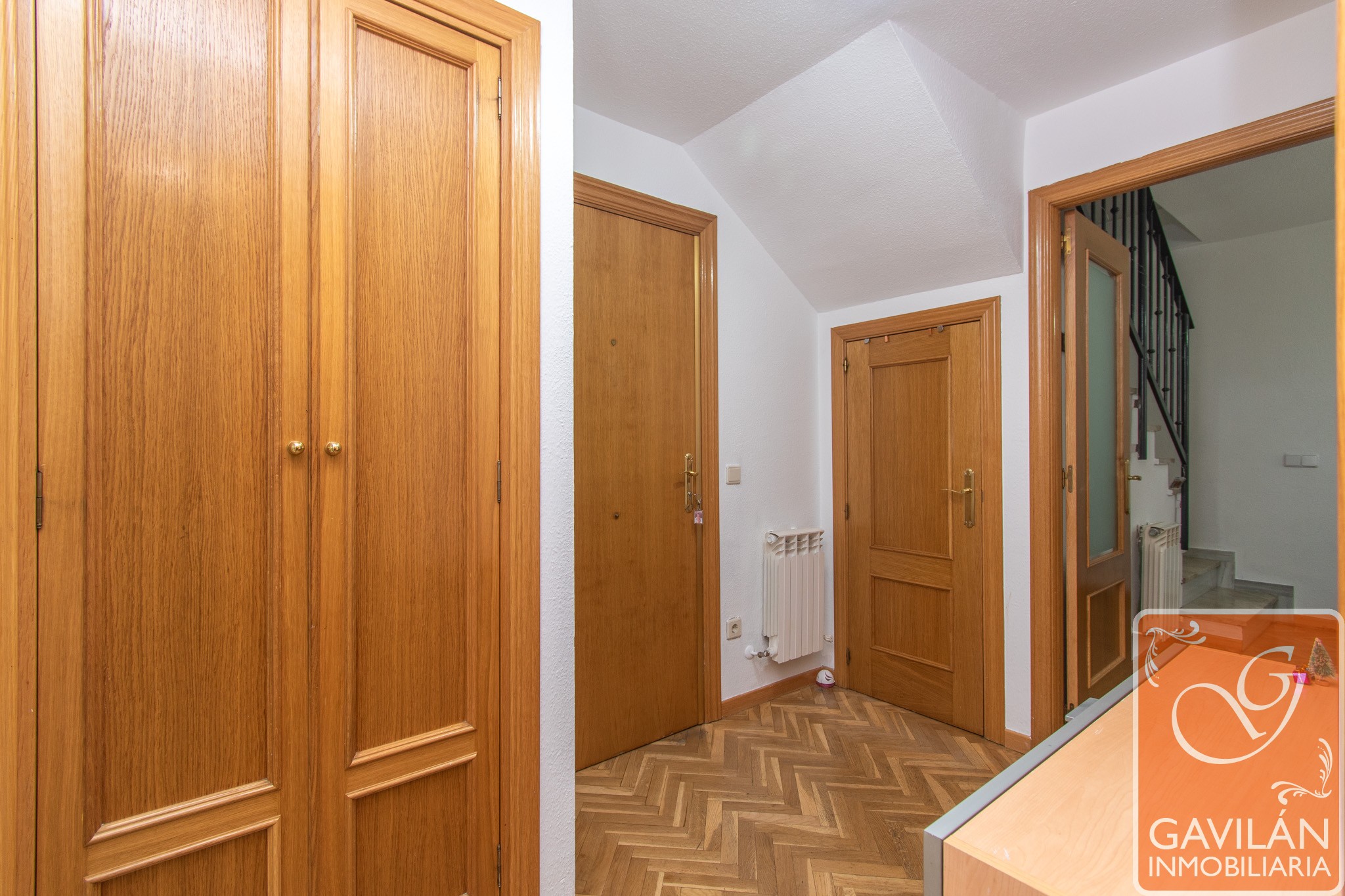 Cómodo Hall equipado con un armario empotrado de dos cuerpos, otro armario bajo la escalera ideal para almacenaje, puerta blindada y portero automático.