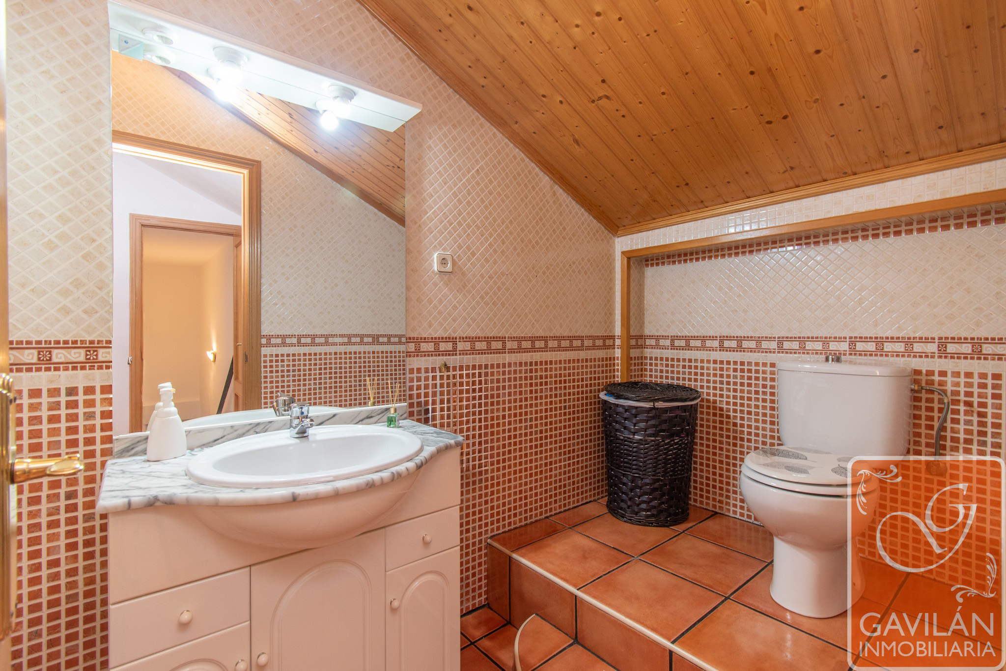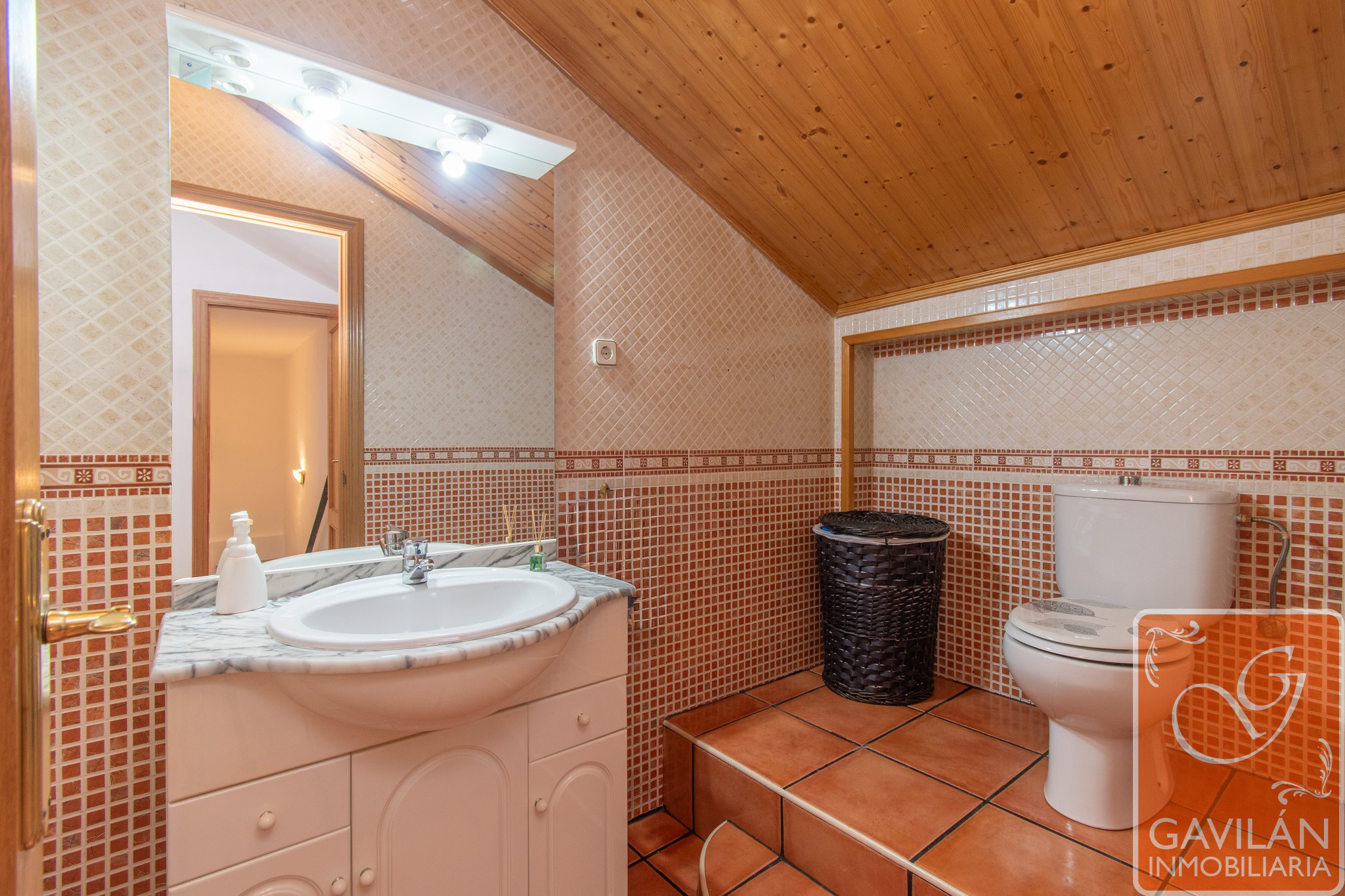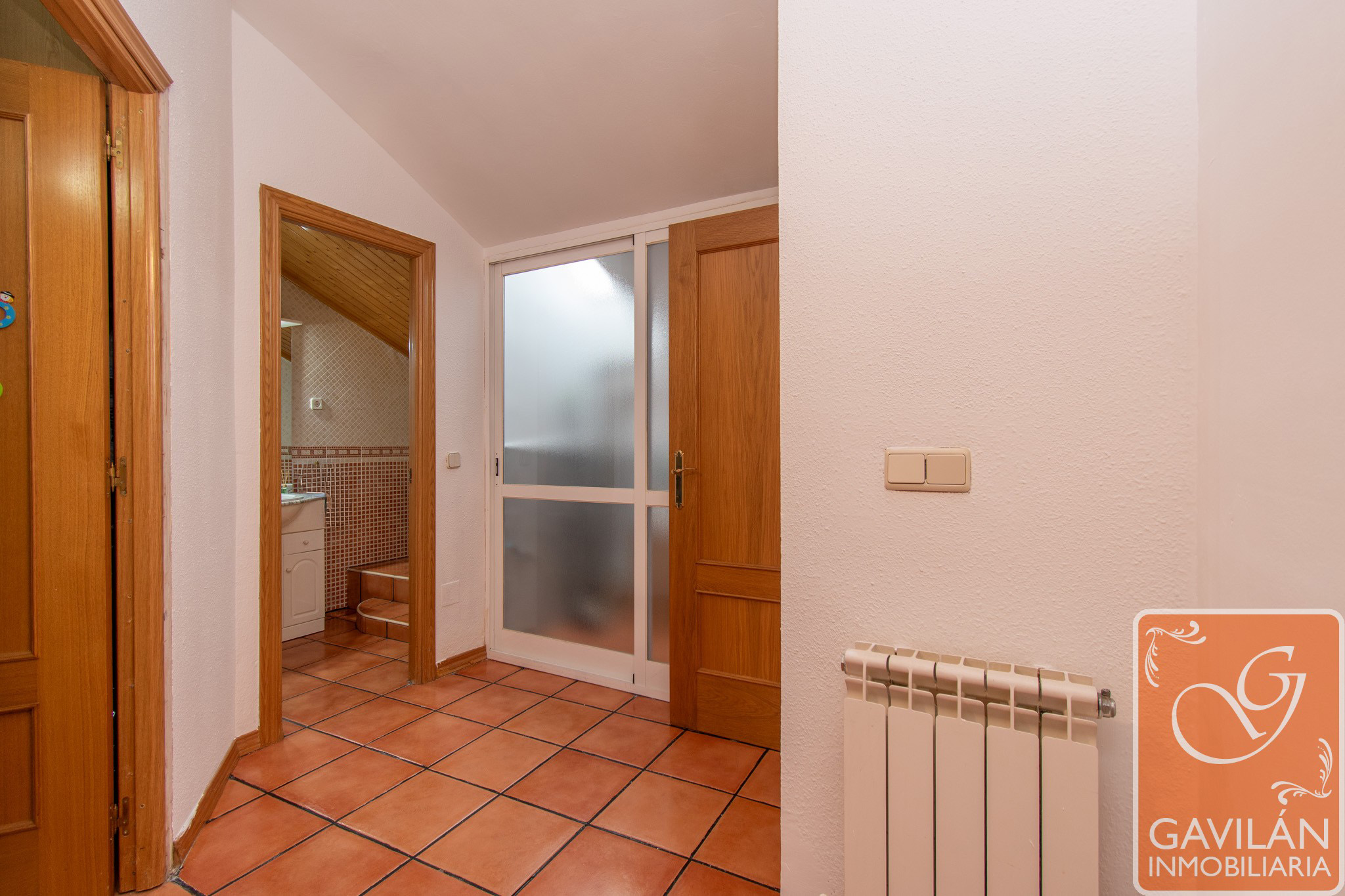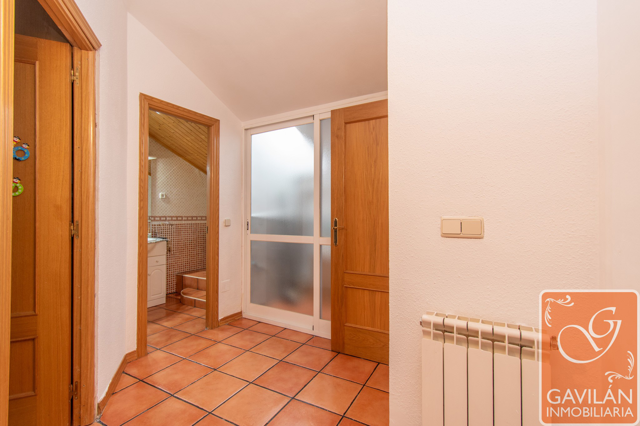 En la planta alta, el distribuidor da paso al segundo baño, con WC, lavabo con armario, espejo. En la misma planta también se encuentran dos amplísimos dormitorios, uno con armario empotrado de tres cuerpos totalmente forrado y vestido y aire acondicionado con bomba de calor
