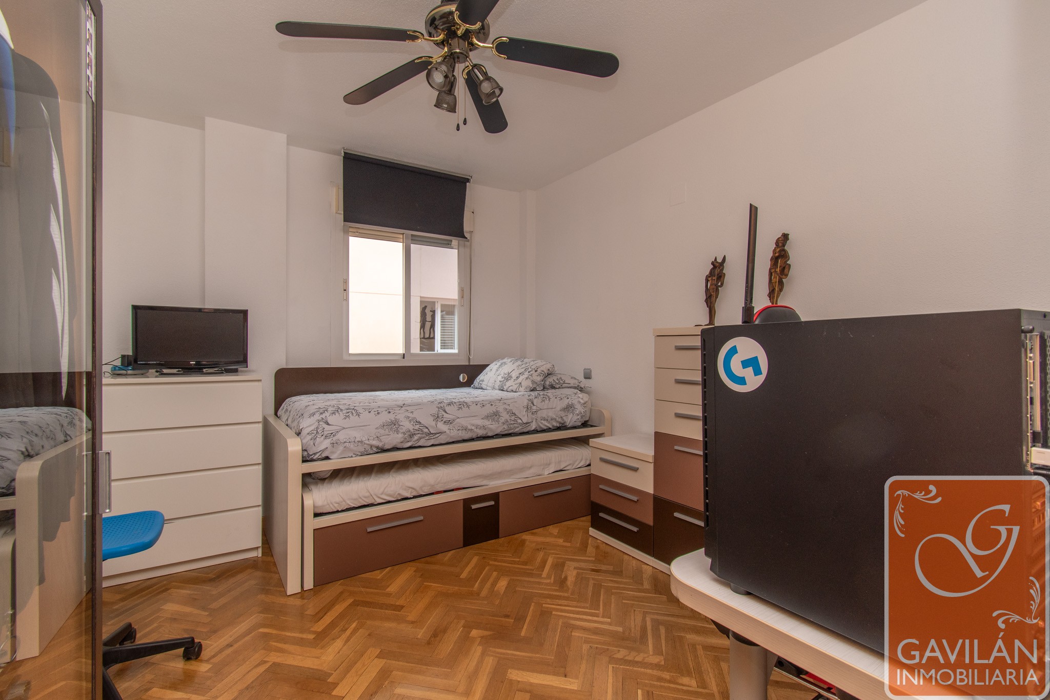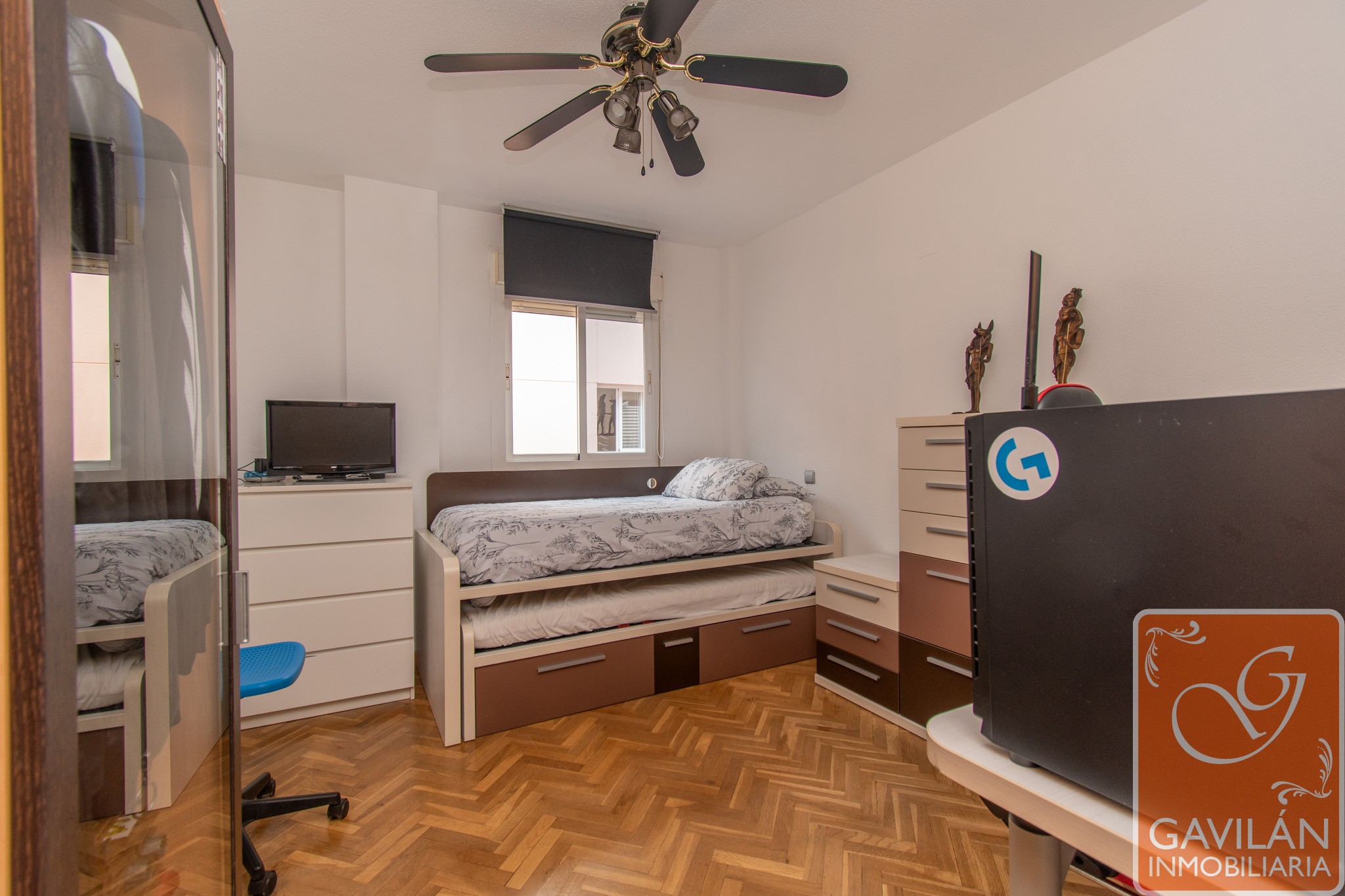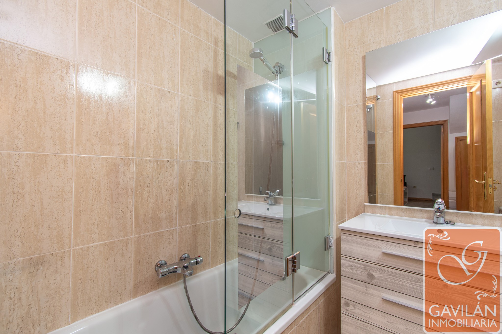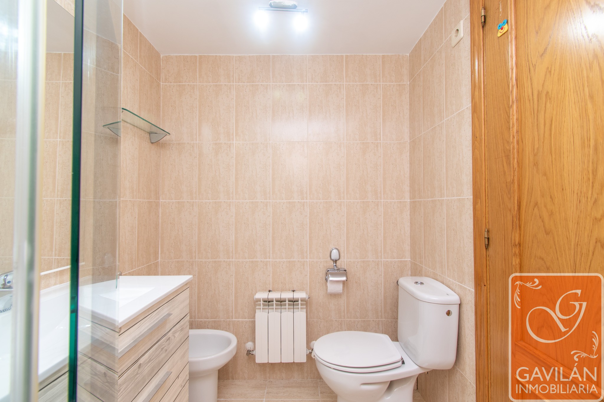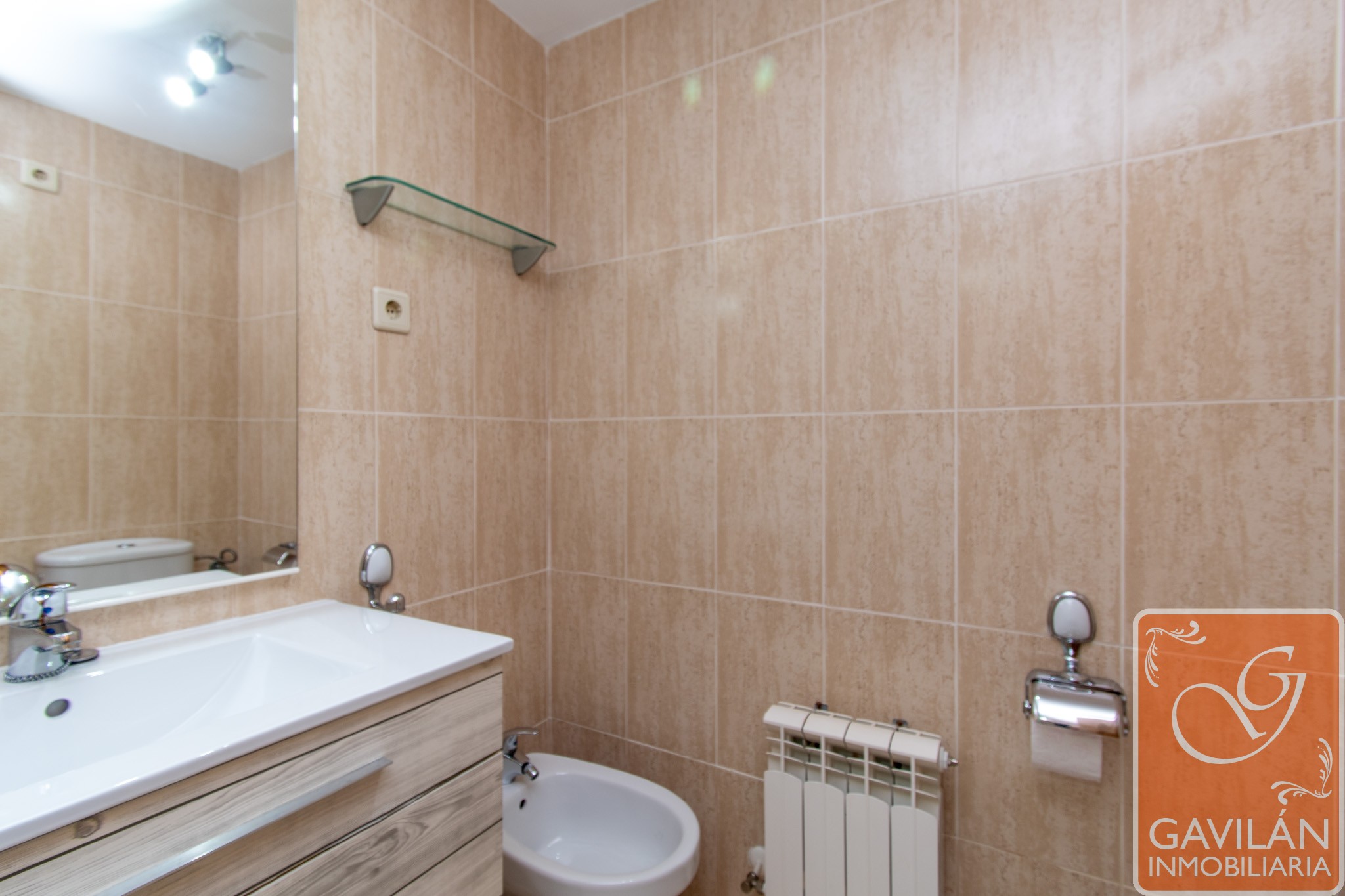 En la planta alta, el distribuidor da paso al segundo baño, con WC, lavabo con armario, espejo. En la misma planta también se encuentran dos amplísimos dormitorios, uno con armario empotrado de tres cuerpos totalmente forrado y vestido y aire acondicionado con bomba de calor