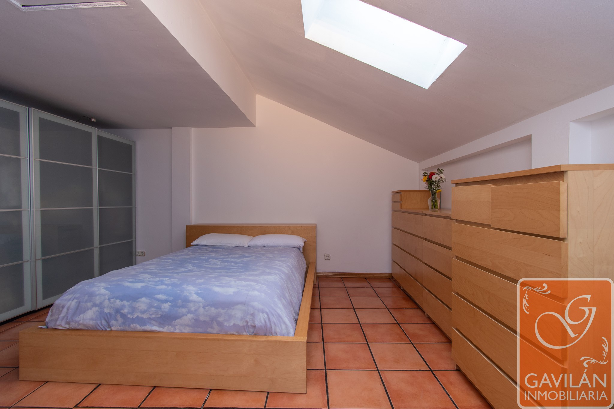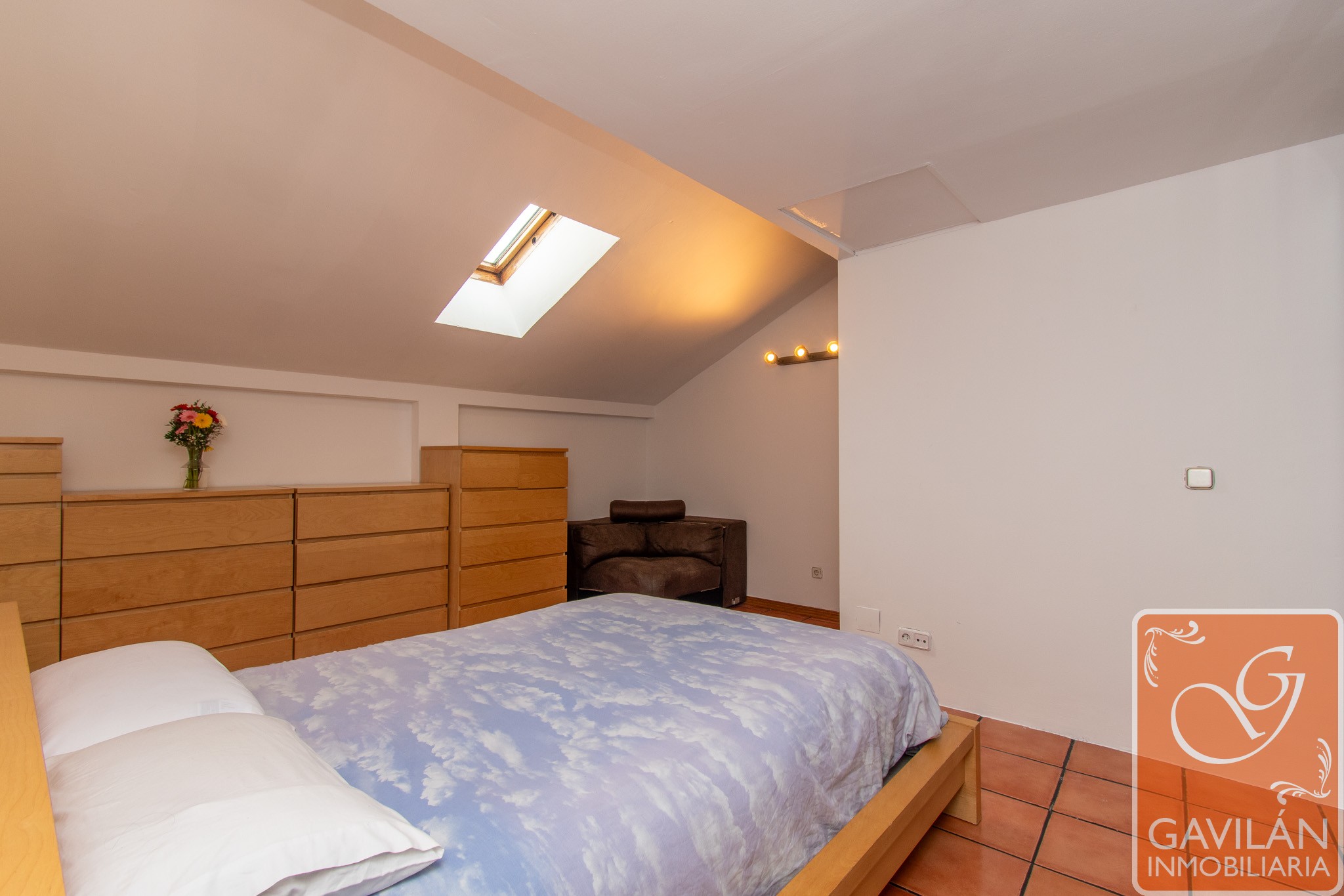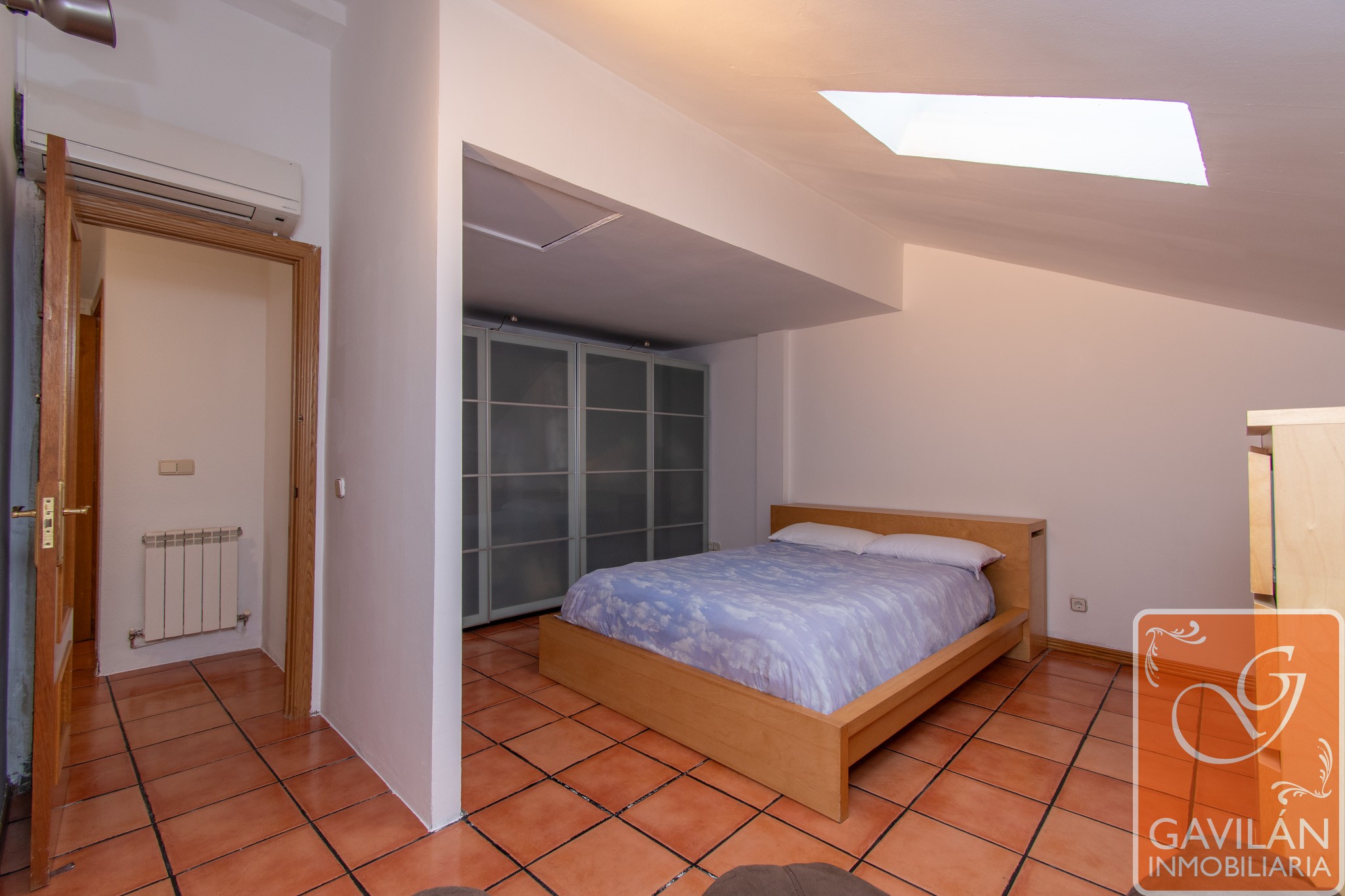 El dormitorio principal es muy cómodo ya que antes eran dos habitaciones, ahora un solo espacio amplio y confortable, con Velux, aire acondicionado.