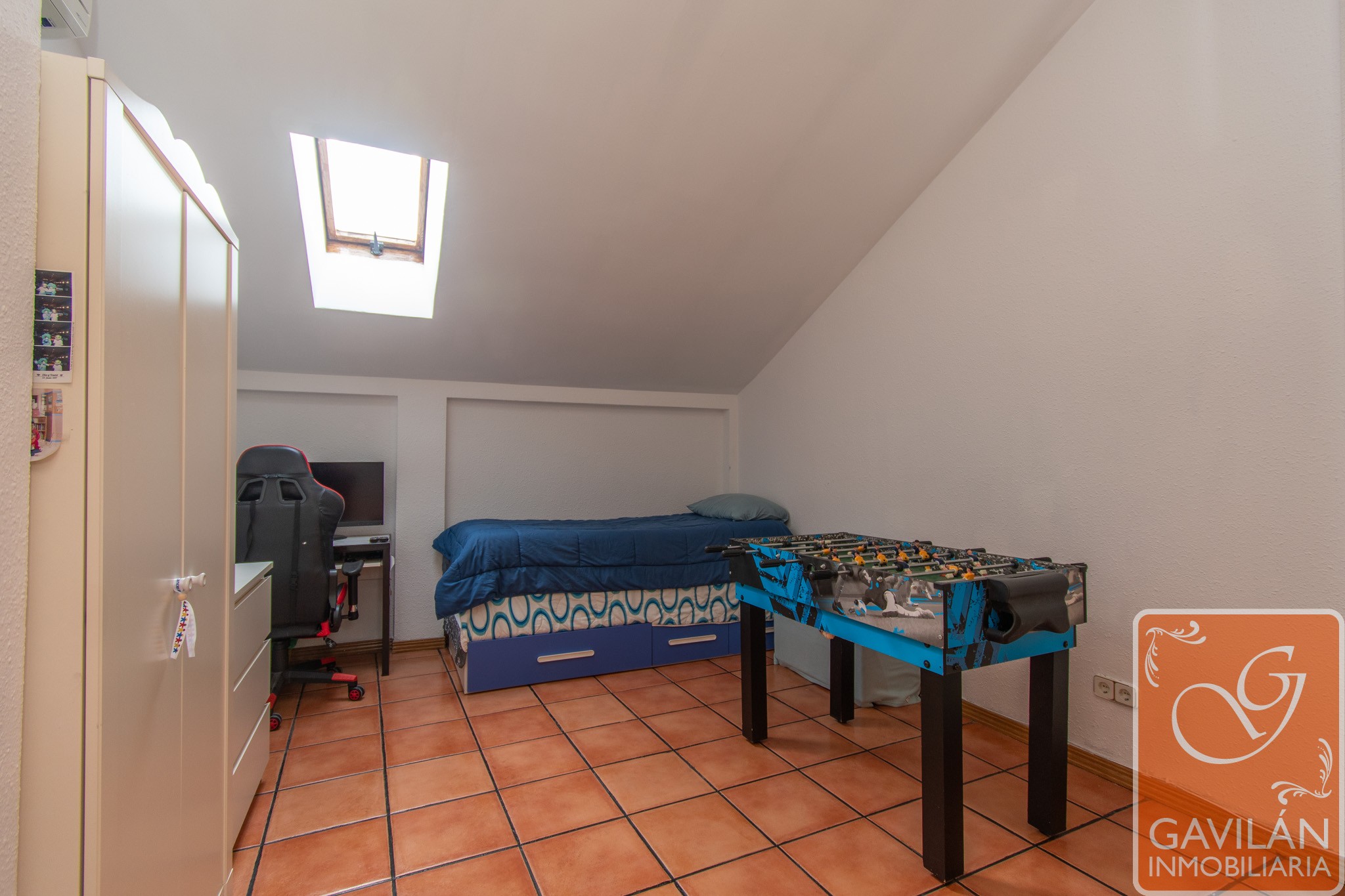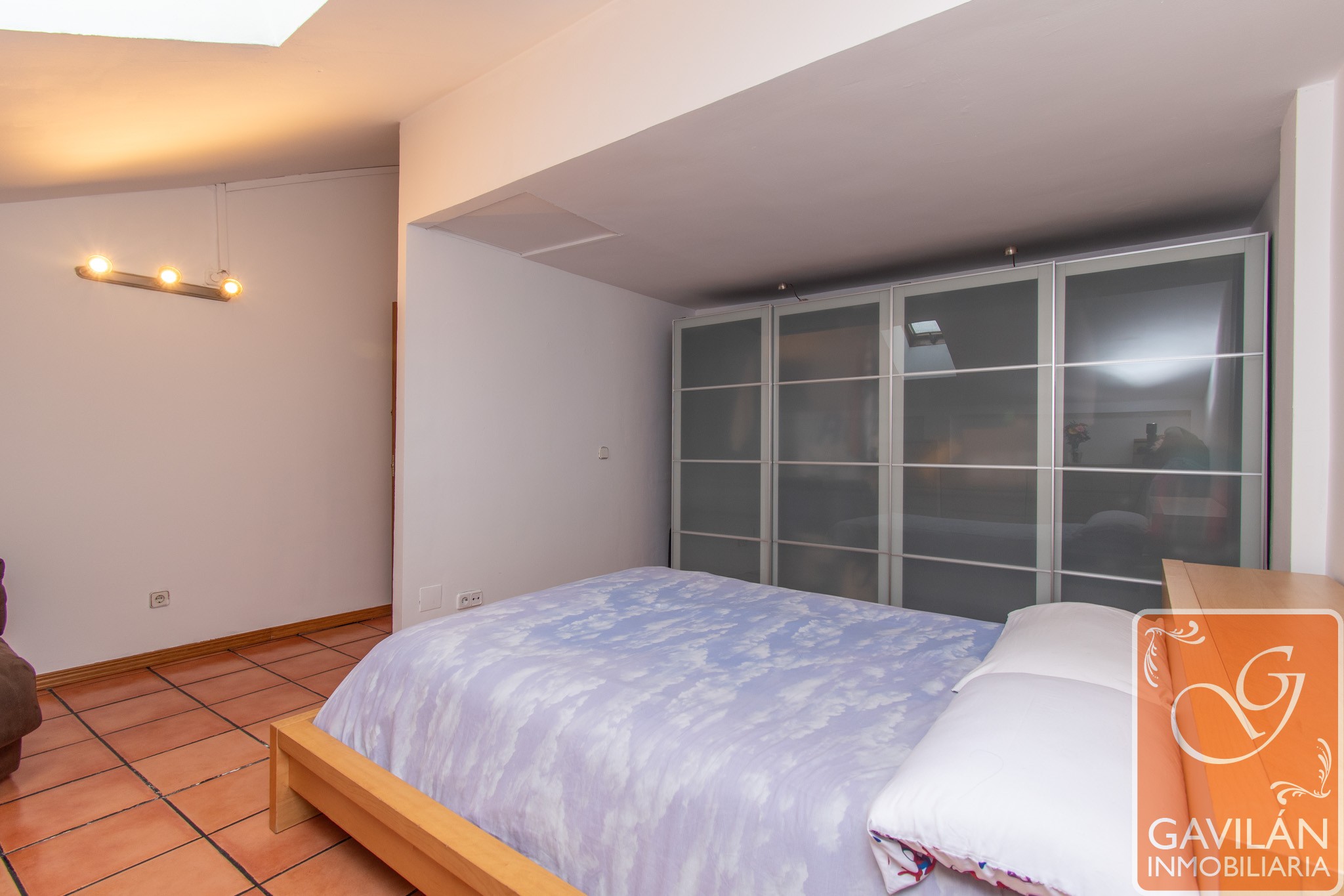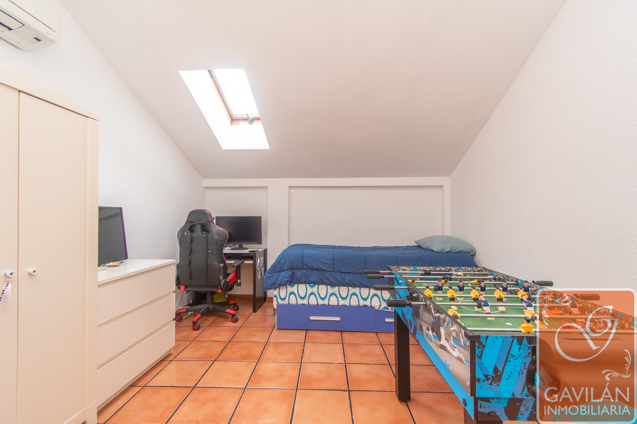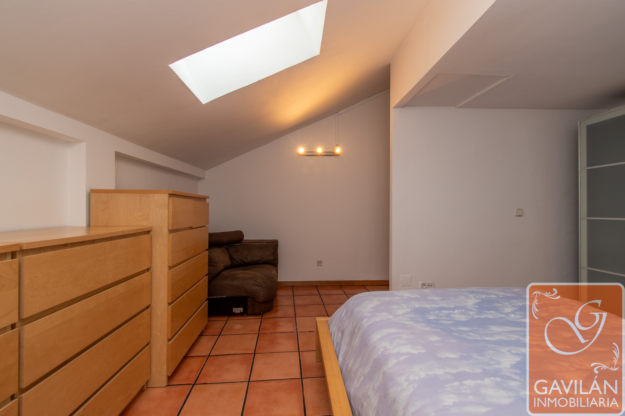 El dormitorio principal es muy cómodo ya que antes eran dos habitaciones, ahora un solo espacio amplio y confortable, con Velux, aire acondicionado.